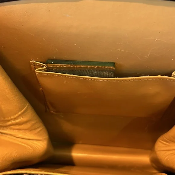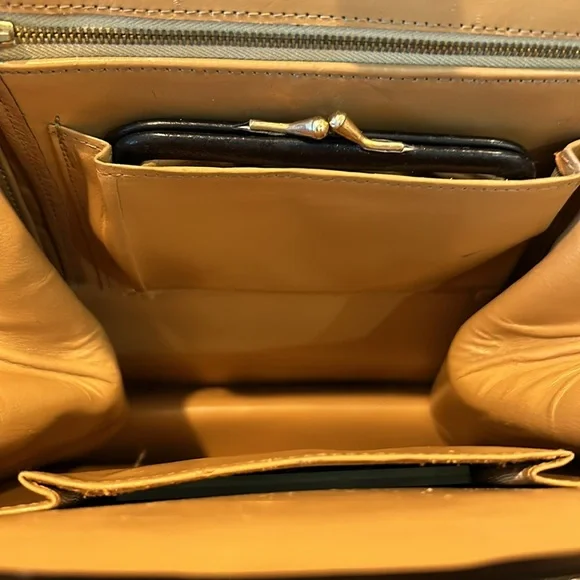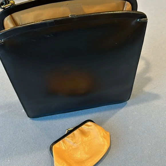 Vintage 1950s leather handbag made in France comes with a leather satin lined coin purse, zippered compartment and double sided mirror in an interior pocket. Slight patina wear on...