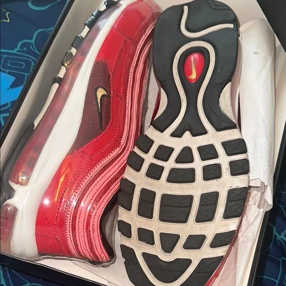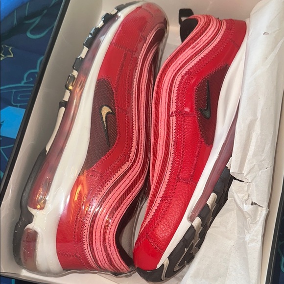Bold red Nike Air Max 97 with sleek black accents. Iconic design with visible air cushioning.