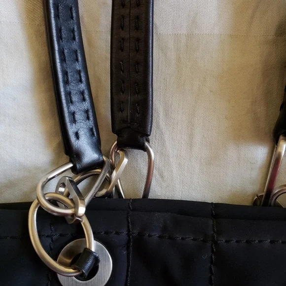 No tag info on materials. However, the doubling stitching straps are thick, looksand feels like leather. The bottom has a smooth calfskin leather appearance and feel that the designer is known for making.Spacious compartment, inside zipper pocket, inside red leather compartment. Designer´s logo on all zippers, on bottom studs, and inside. Thread pulling on some spots and signs of weararound bottomstrap loops as depicted in attached photo.No partical payment!
