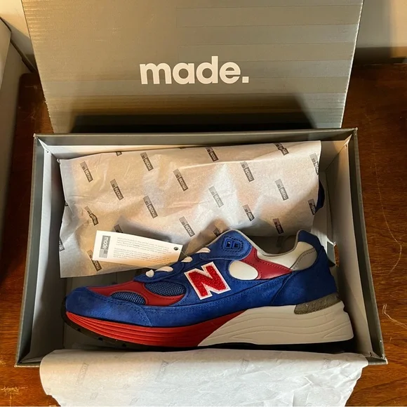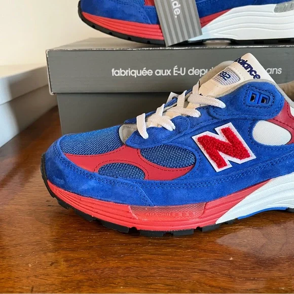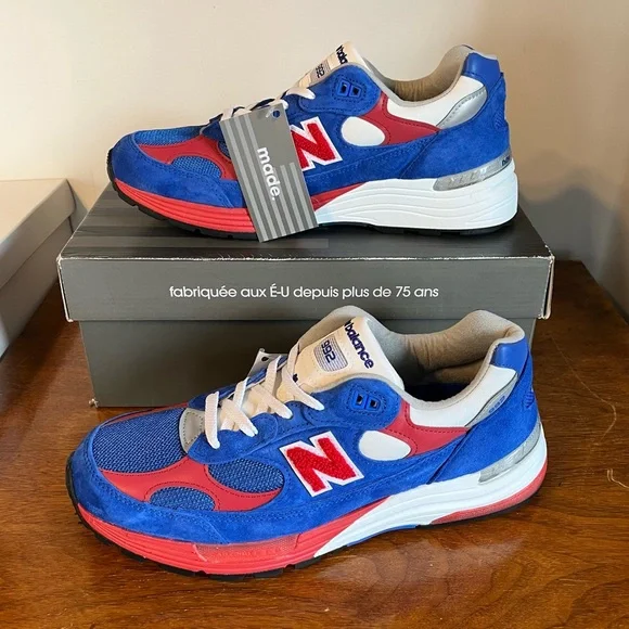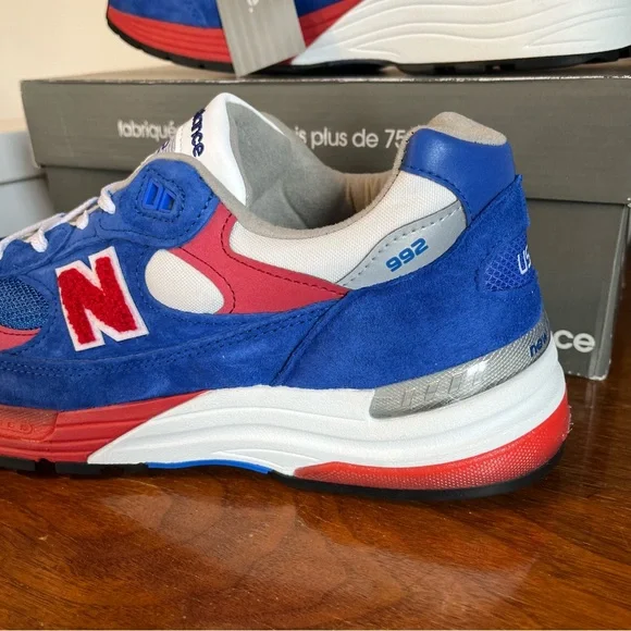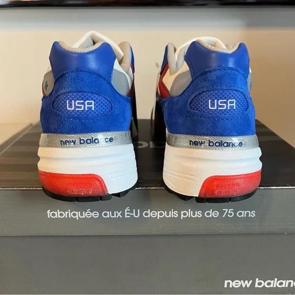 The comfortable New Balance 992V1 in a colorful red, white, and blue USA design.Classic sturdy NB heritage design with lace closure, breathable mesh upper, and rubber outsole.Red chenille “N” logo on sides, and USA on heels.Great looking shoe. NWT mint condition. NH5AS3X0GG8