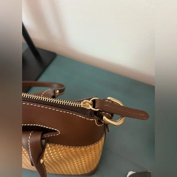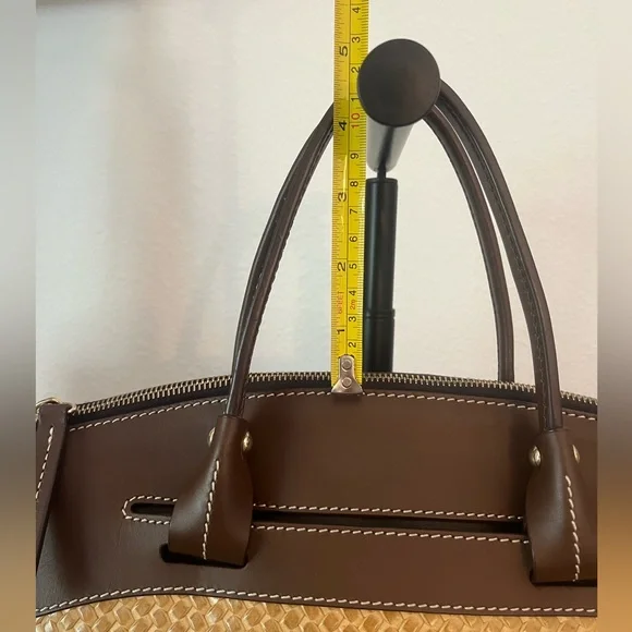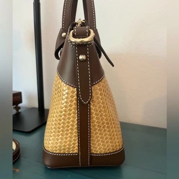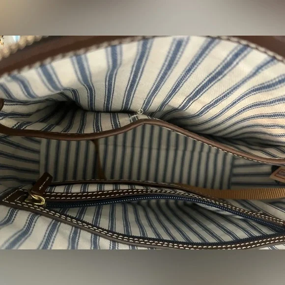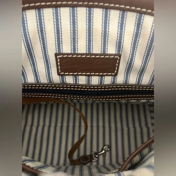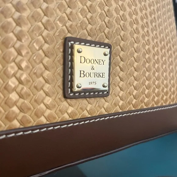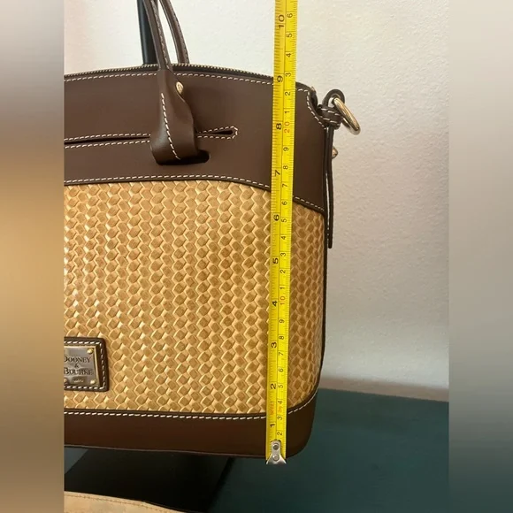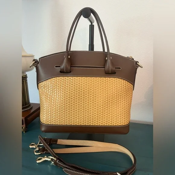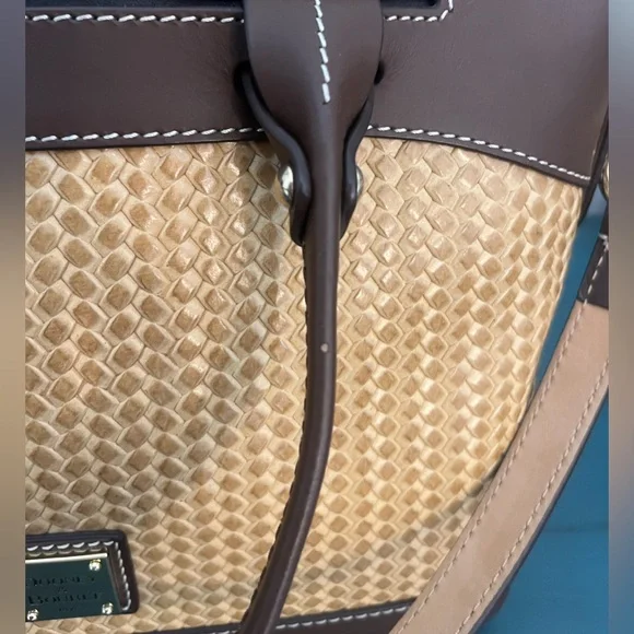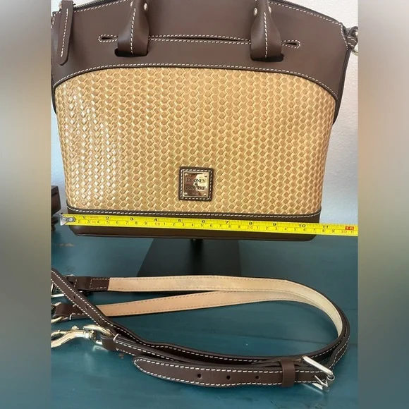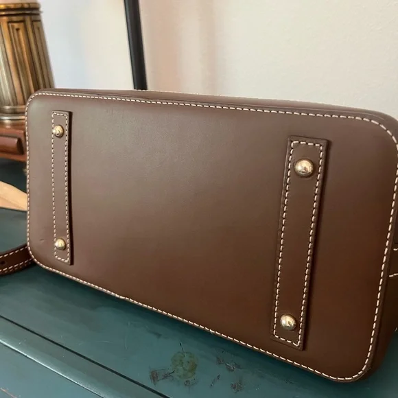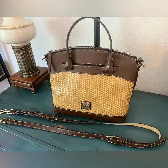 Tan and brown domed satchel from Dooney & Bourke. Features double handles and a removable strap that can be used either as a shoulder strap or with an included third piece that...