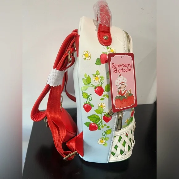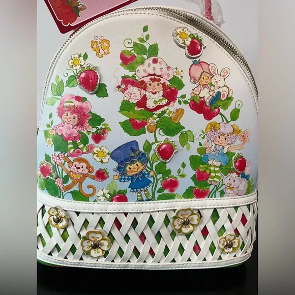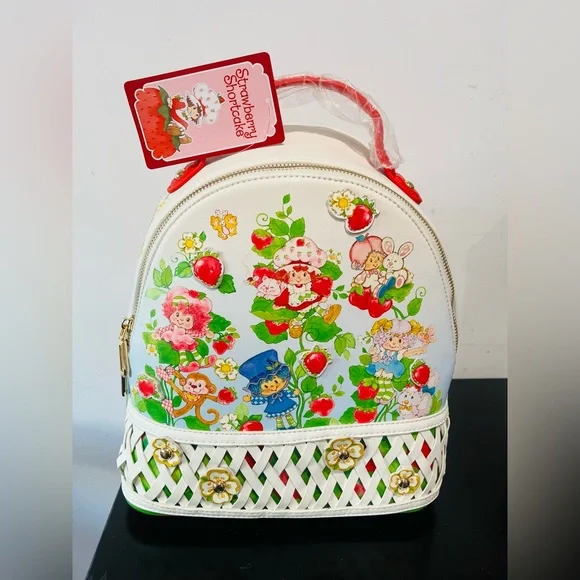 Strawberry Shortcake and Friends Strawberry Garden Mini BackpackThis mini backpack features a design of a Strawberry and her friends among strawberry plants, the front of this bag includes an applique fence and floral details.PolyurethaneApprox. 10" W x 11" H x 5 1/4" DNew with tags