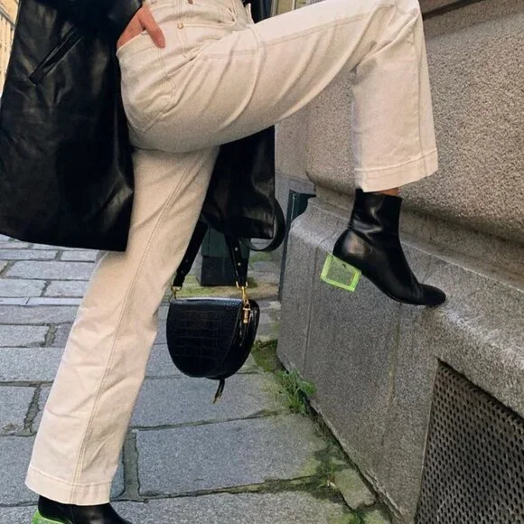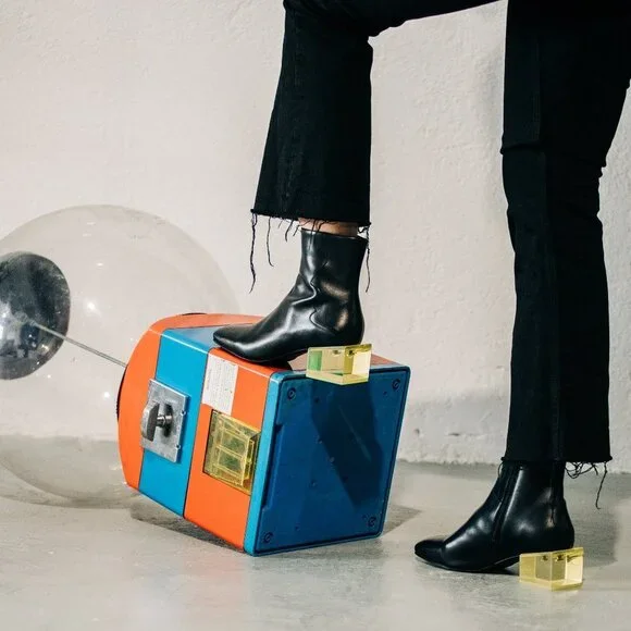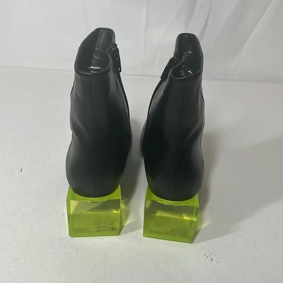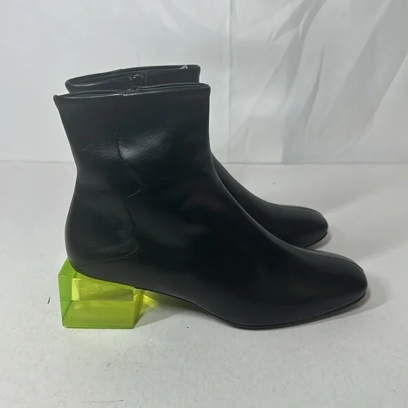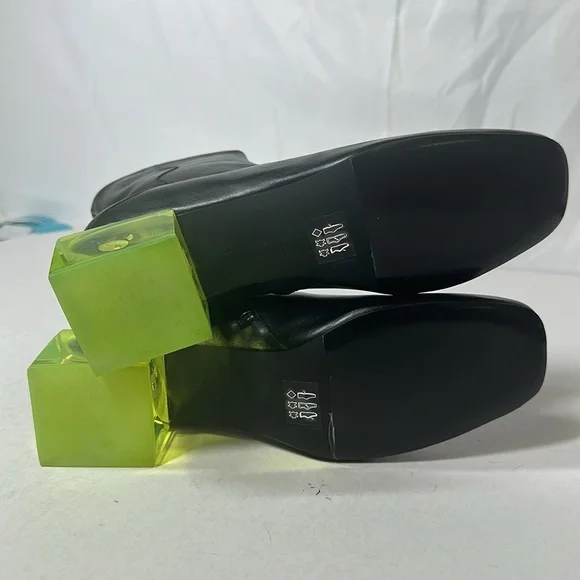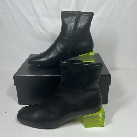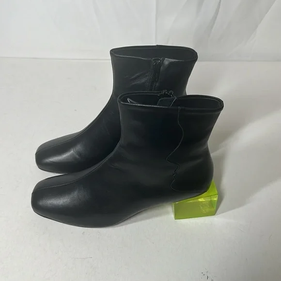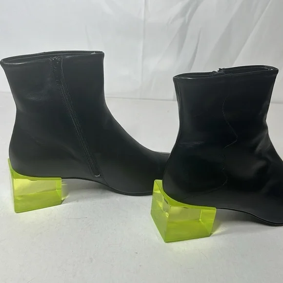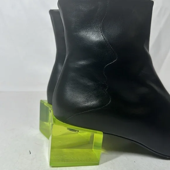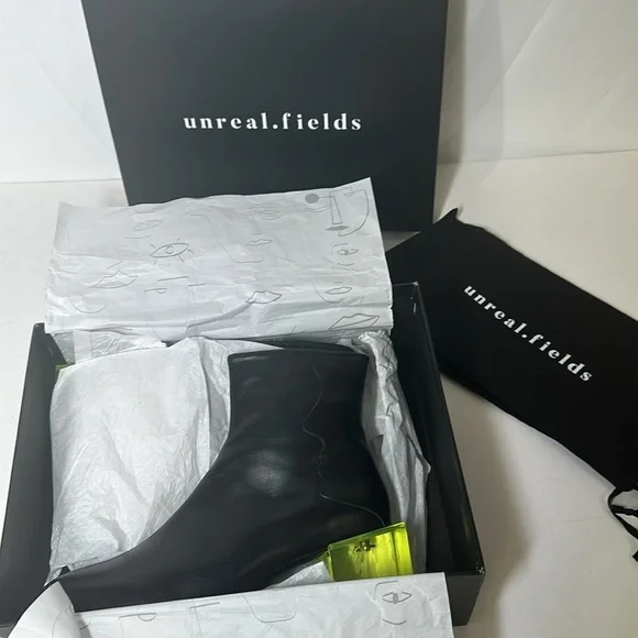 Unreal Fields Statuette - Black Leather Acrylic Heel BootsBrand new with tags and box.Size EU 41 / 9.5 USDESCRIPTIONA square toe boot with a cube shaped heel, resembling the base of a Statuette. Contemporary style that combines premium leather with a vibrant coloured acrylic middle heel, a leather contrast colour lining and cushioned insole for extra comfort.Handcrafted in PortugalHeel Hight 5 cmCompositionUPPER - Calf leather- BlackLINING - Calf leather - LavanderSOLE - Neolite - BlackHEEL- Acrylic - LemonCLOSURE- Side zipColourBLACK