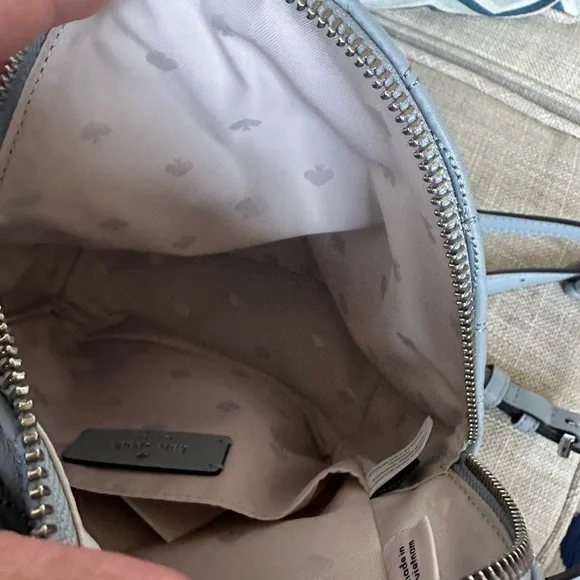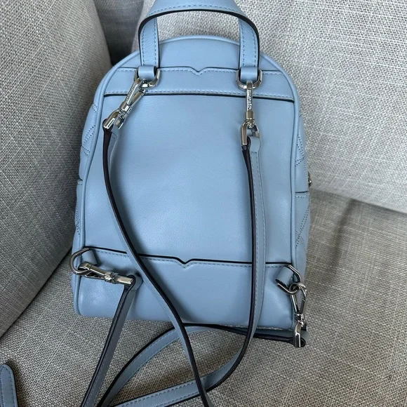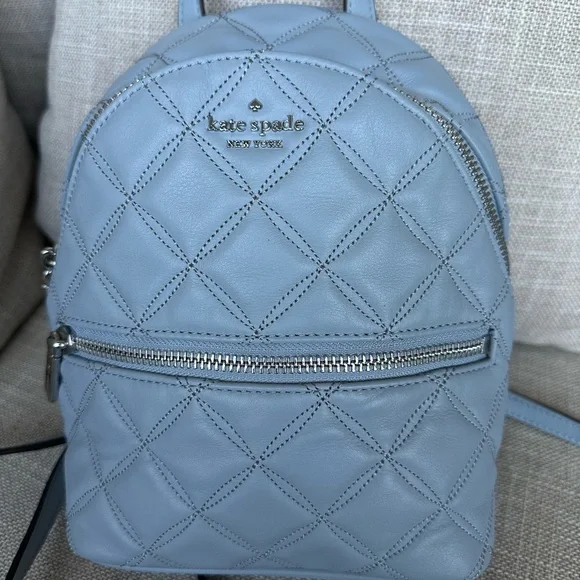 Kate spade Natalia quilted backpack NWOT. Like new! Clean interior and exterior. Convertible two way bag! Baby blue!Measures7.9´´h x 6.5´´w x 3.5´´dquilted smooth leathertwo way spade jacquard liningmetal pinmount logointerior slip pocketexterior zip pocket