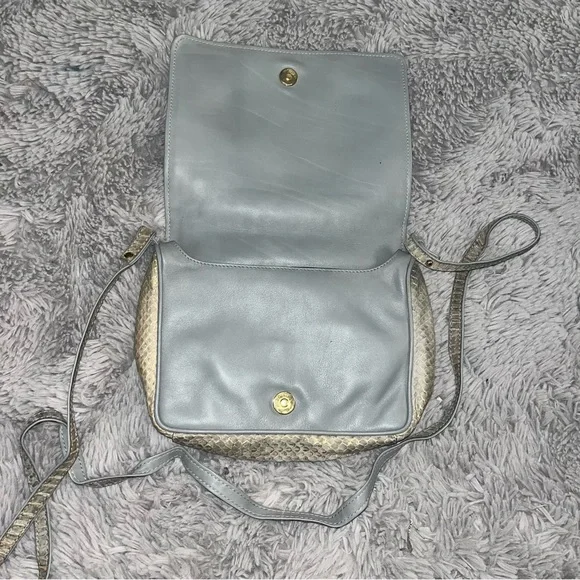 This luxurious crossbody bag by Donna Karan features a captivating gold color and a sophisticated snakeskin texture. Its sleek design and adjustable strap offer both style and convenience for any occasion. Elevate your accessory collection with this chic and versatile piece.Vintage from 1990´s Era .Genuine Snakeskin. Never worn. Still has the plastic tag attach to it.