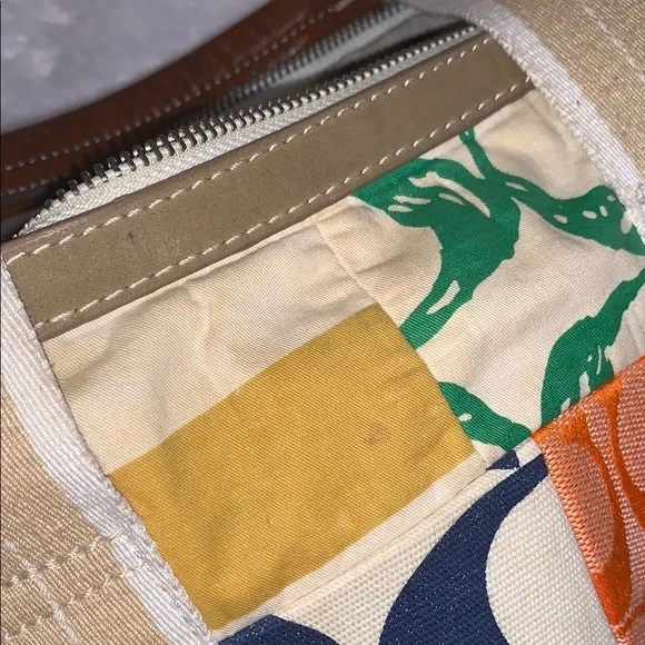 Stylish and vibrant patchwork canvas tote bag. Features a mix of colors including cream, brown, and green. Perfect for adding a pop of color to any outfit. Some small flaws (see pics) priced accordingly, AS IS.