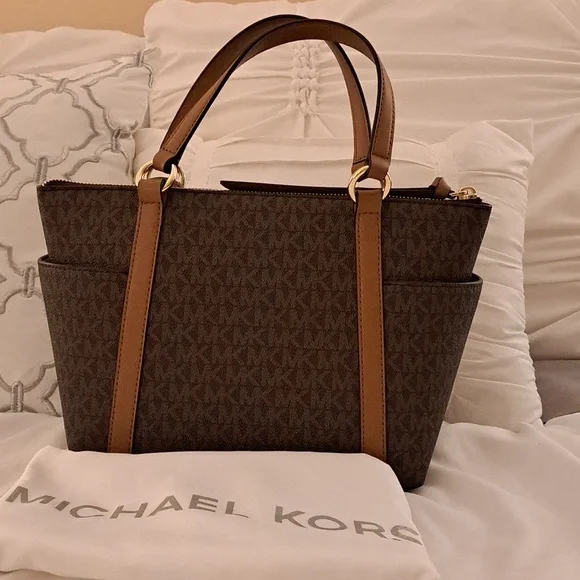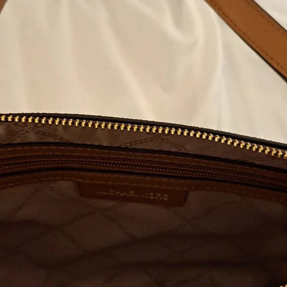 NWOT Michael Kors monogram bag in brown and luggage color with gold accents. Brand new without tags, I purchased it thinking I was going to use it but could not return. Dust bag included. See photos for measurements.