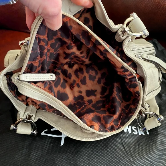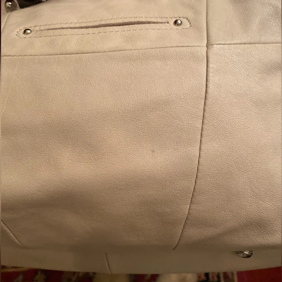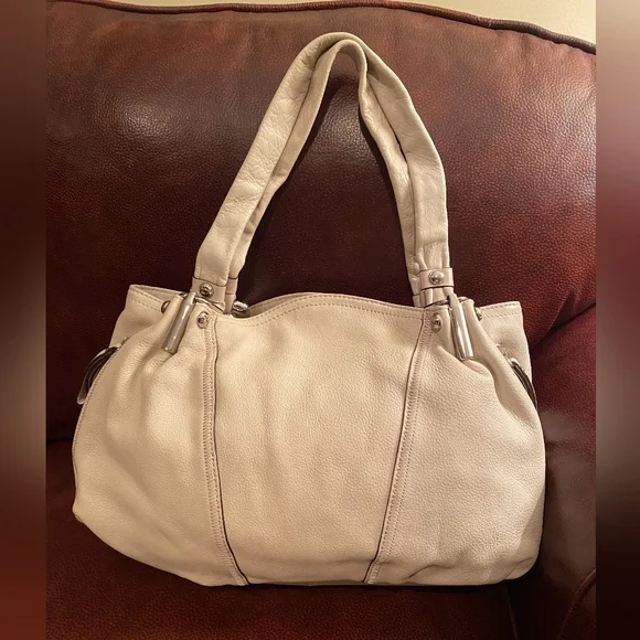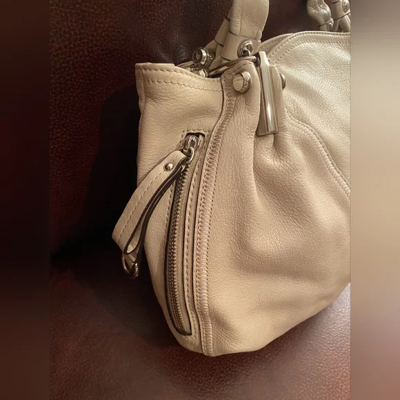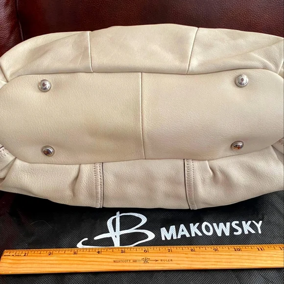 This elegant NWOT, super soft, pebbled cream 100% leather shoulder bag from B. Makowsky combines sophistication with functionality. The features include double stitching accents, exterior panel design, three large interior pockets (center pocket has a full zipper), coordinating liner, one slit exterior pocket, two exterior side pockets with zippers, metal protectors on bottom of bag, double carrying straps with silver metal hardware... all surrounded by uber soft pebble leather!This shoulder bag has been kept in its original dust cover, which is included. Review the last picture of the slight mark on the back of the bag, otherwise in EXCELLENT CONDITION. Smoke-free home. Additional pictures provided upon request.