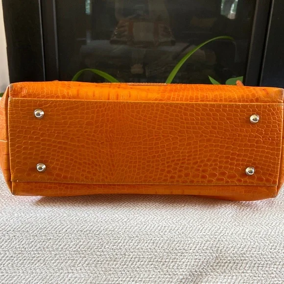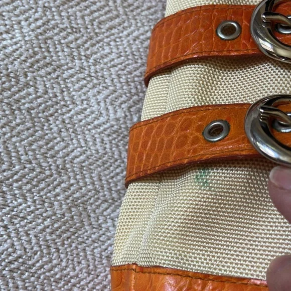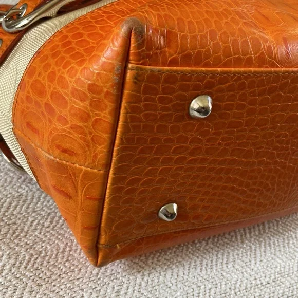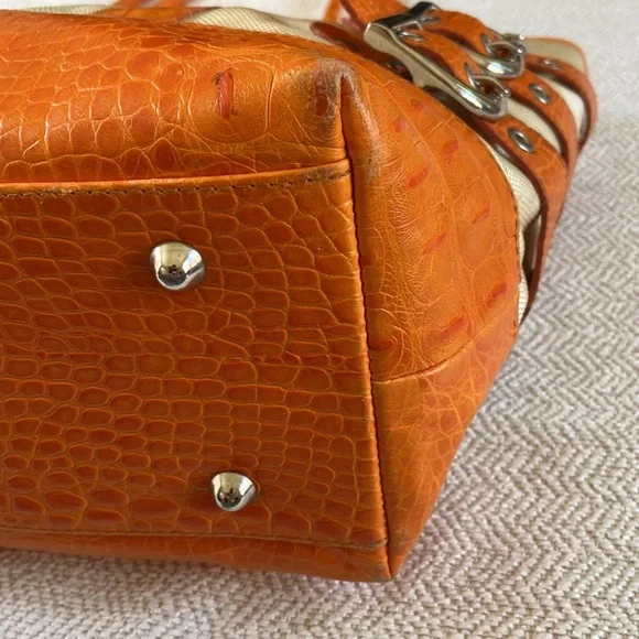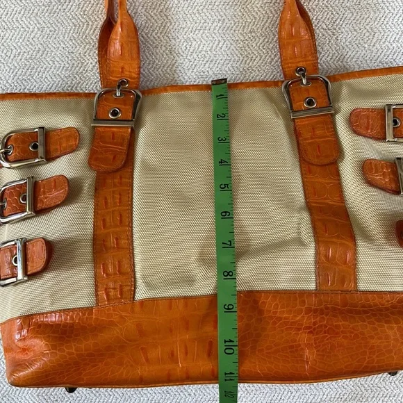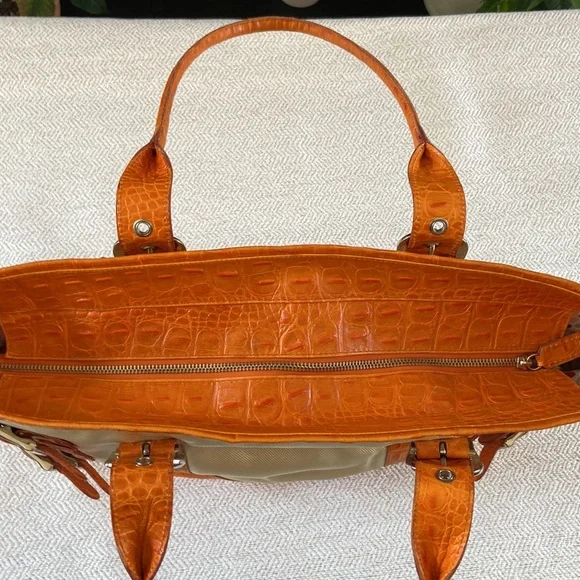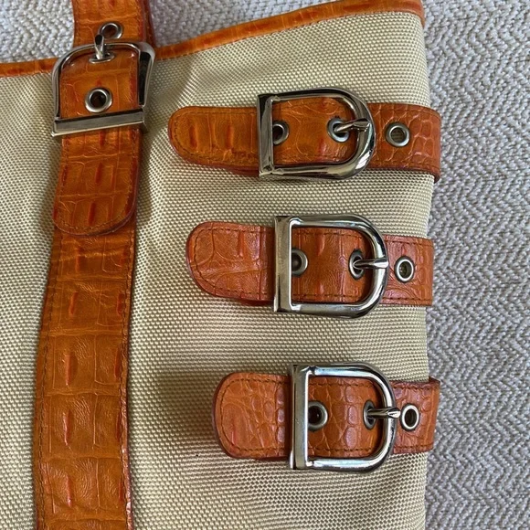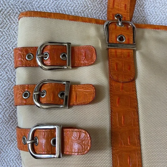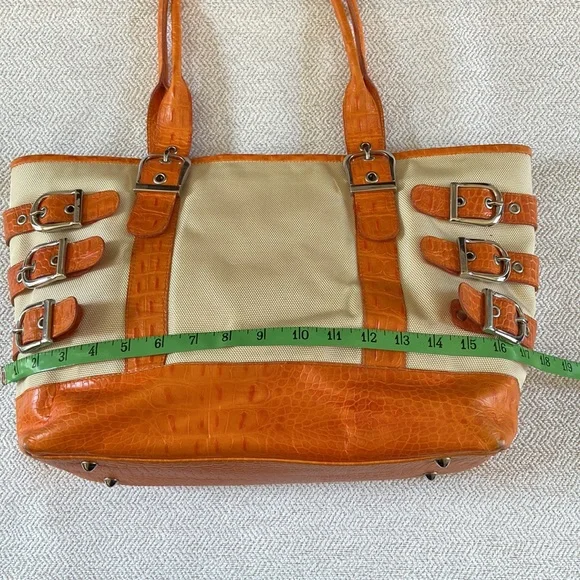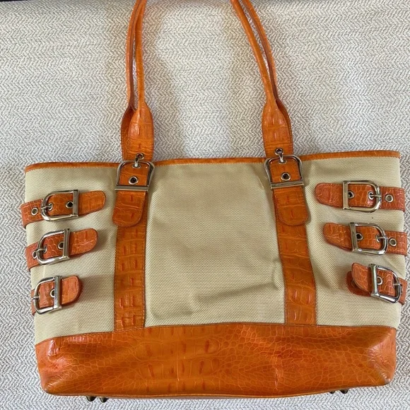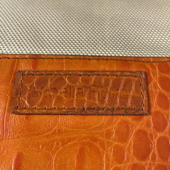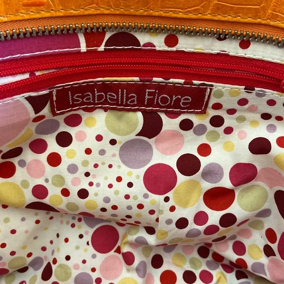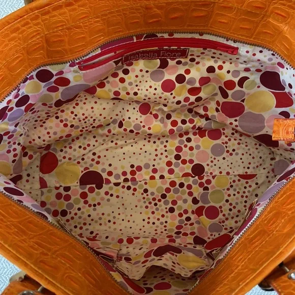 Isabelle Fiore Leather & Canvas Large Tote / Shoulder Bag --Add to your collection of Isabella Fiore bags with this high quality designer tote roomy enough for everyday essentials or travel.Great pre-owned condition, zip top closure, beautiful silver-tone hardware / buckles, orange crocodile leather trim complements the pale yellow / cream canvas tote.Interior: fantastic colorful polka dots lining in excellent condition, 3 slip pockets and one wall zip pocket. Perfect for your next trip!Very light wear on corners and small green mark found under a strap/buckle (see pictures). Priced accordingly. Want more?? Bundle items & save. Reasonable offers considered or countered.Discount final sale.