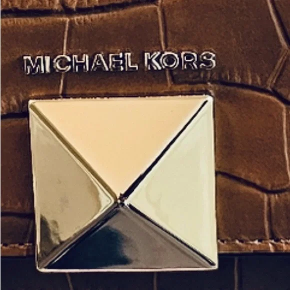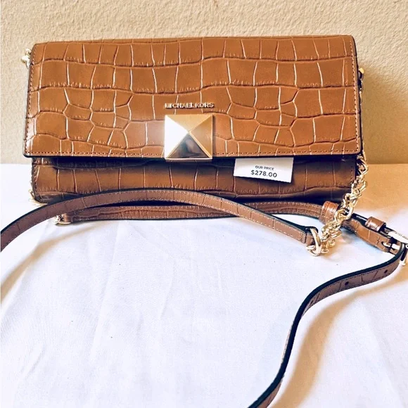 NWT ❤️ This has never even been used card and tags still attached, beautiful leather material, with adjustable shoulder strap and gold chain links in bottom of strap. Lots of...