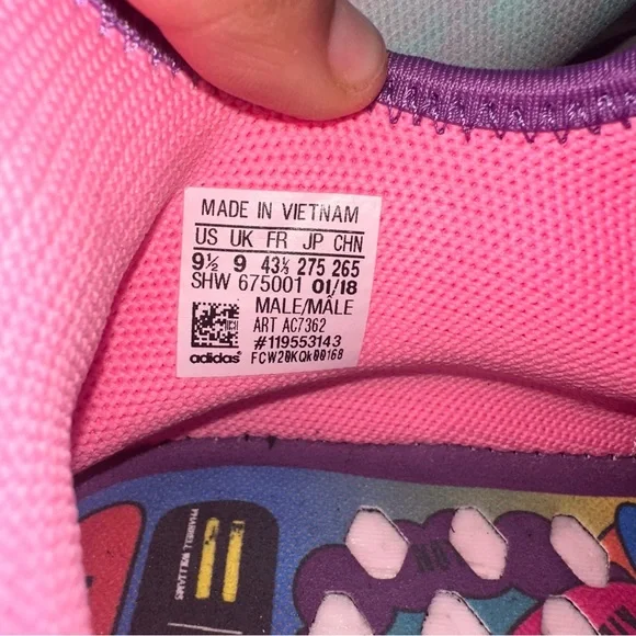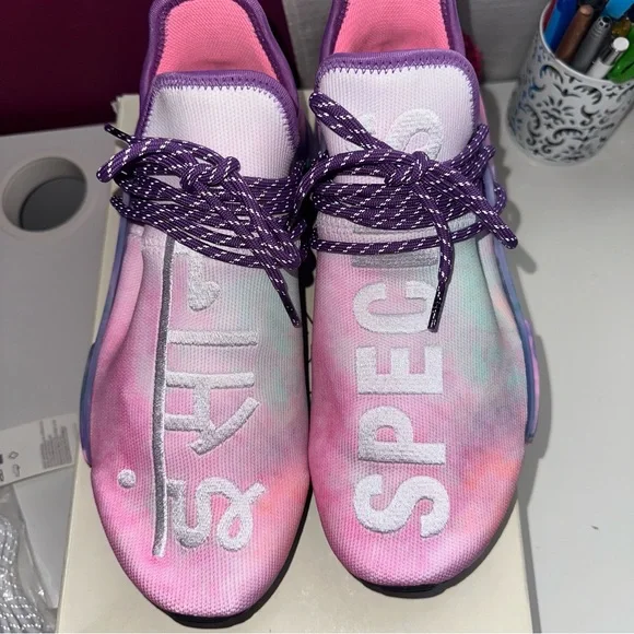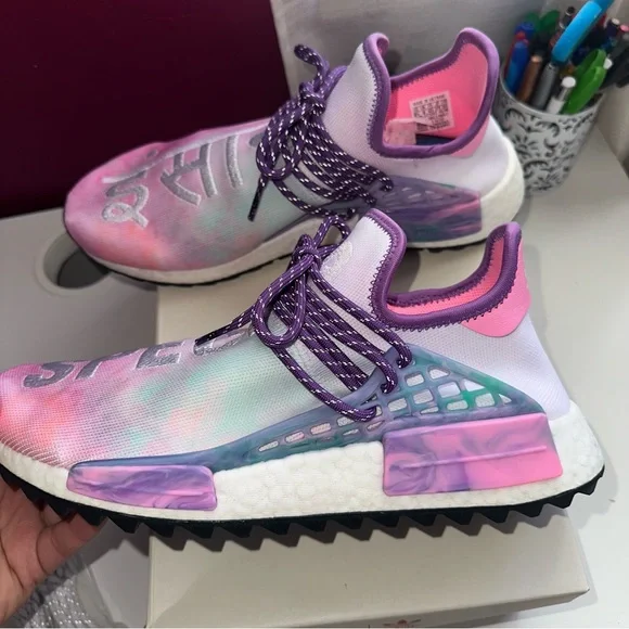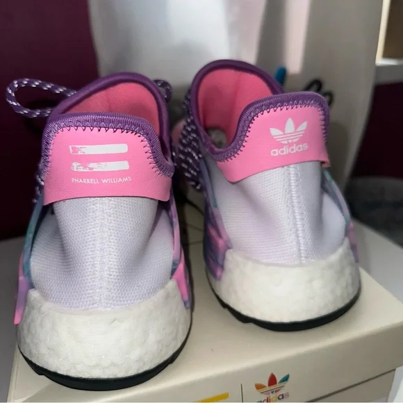 AUTHENTIC Adidas Human Race NMD Pharrell Holi Festival (Pink Glow)Size 9.5 Color: pink, purple & green Condition: NEW with box & extra white rope laces Style: AC7362Men’s sneakers The word ´SPECIES´ is embroidered in white on the upper left shoe, with matching Devanagari text on the right one. Created to honor the Hindu celebration of Holi (festival of color) and love, the "Pink Glow" brings the colors of the festival to life. Featuring a powder dye finish across the knitted mesh upper, the sneaker also sports a white Boost midsole and black trail rubber outsole to make the colors pop.