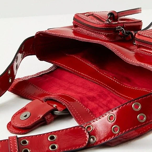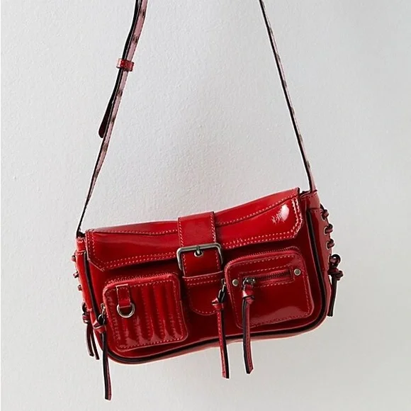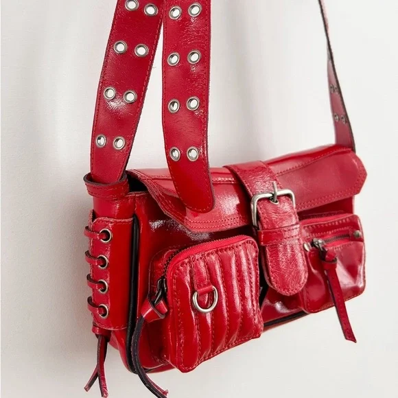 Free People crossbody collection too-cool bag featured in a smooth leather fabrication and structured silhouette with bold buckle detail at the front and zippered compartments allover. The coolest way to carry all your things, this bold bag adds an unexpected touch to any outfit. Smooth leather fabrication, cotton-lined interior, flap style with snap-button closure, three zippered compartments at front, lace-up detail at sides, adjustable shoulder strap with grommet detail Import Height 5.51” Shoulder/Strap Drop 17.72” Depth 1.58” Width 9.25” Luxe high shine red BRAND NEW without tag