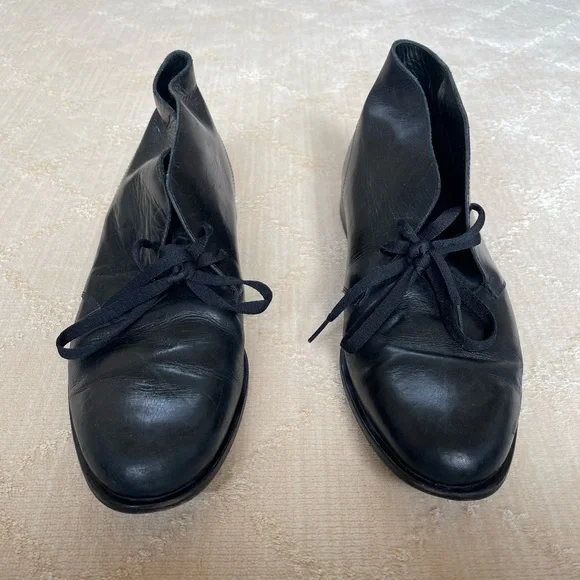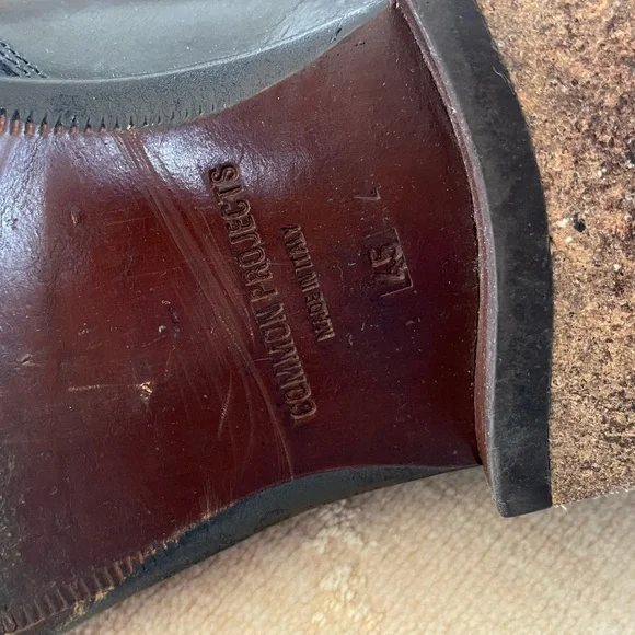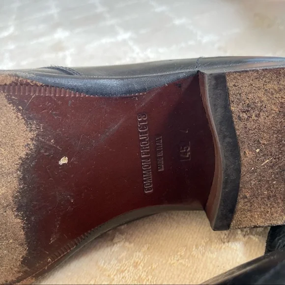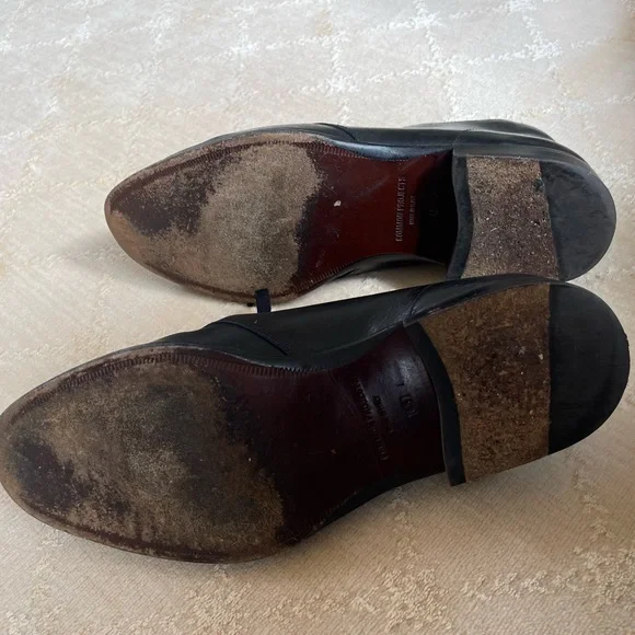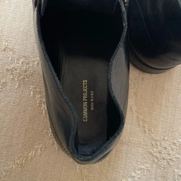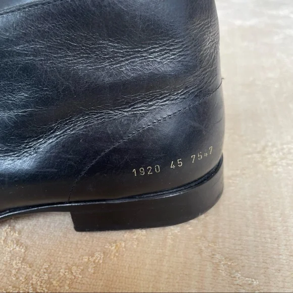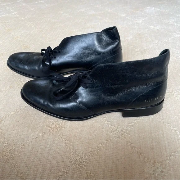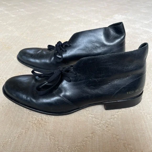 Common Projects men’s black leather short Chukka boots.-Made in Italy-Gold stamped-Leather interior and exterior-Lace up
