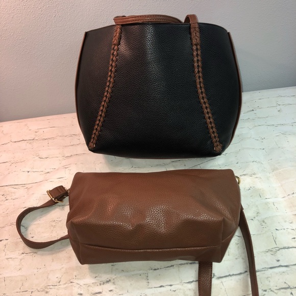 BCBG Paris Reversible large Braided Tote and Handbag two piece travel set in Black and Brown. 3 in 1! Vegan leather. Used once, in excellent condition. Large black tote has brown and gold braided accents with double shoulder straps and brown interior. Smaller adjustable strap crossbody is all brown with zipper closure and fabric lining pockets. Smoke free home. Measures approximately:Tote:18” length 11” height 4” width 11.5” strap drop Crossbody:14” length 9” height 4” width (A47@C)
