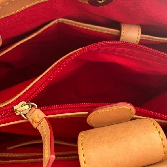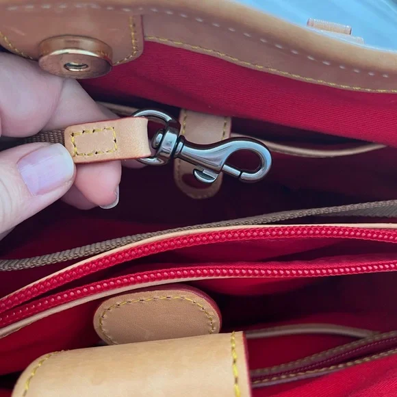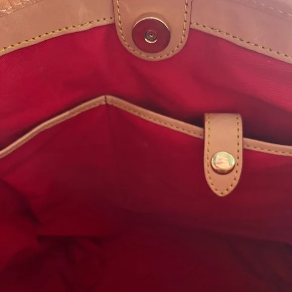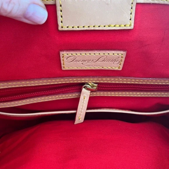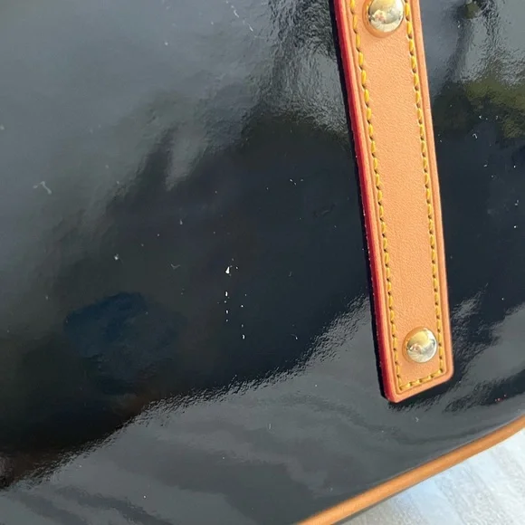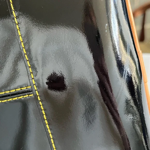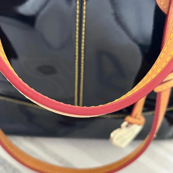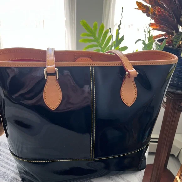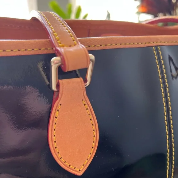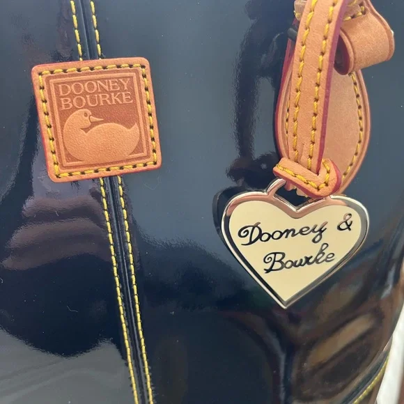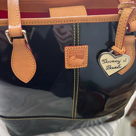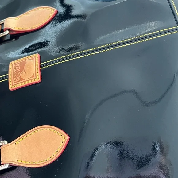 DOONEY & BOURKE BLACK PATENT LEATHER PURSE • TOP OPENING MEASURES 15” • HEIGHT 10 1/2” • DEPTH 6 1/2” • MAGNETIC SNAPCLOSURE • 3 SEPARATE SECTIONS INSIDE OF BAG - MIDDLE SECTION ZIPS - ONE SIDE 2 SIDE POCKETS - OTHER SIDE HAS ZIPPED POCKET WITH OPEN POCKET UNDERNEATH • ALSO HAS KEY FOB • COMES FROM SMOKE FREE HOME • MINIMAL USE AS YOU CAN TELL BY THE BEAUTIFUL STRAPS • STRAP DROP 9” • TRIED TO CAPTURE SCUFF NEAR BOTTOM OF PURSE • BOTTOM HAS 6 TINY MARKS • A COUPLE WATER MARKS on SNAP CLOSURE