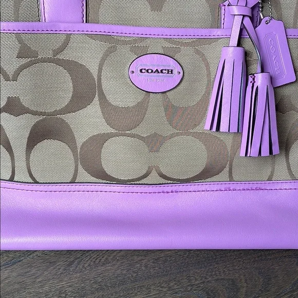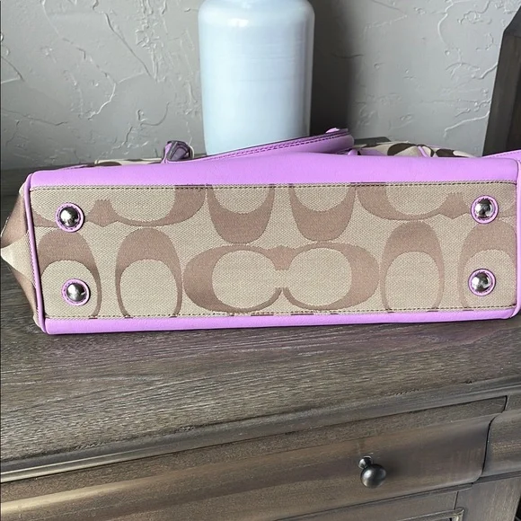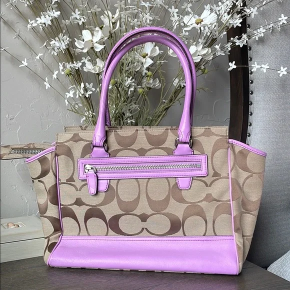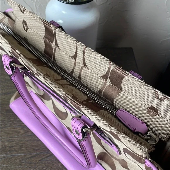 Discover the elegance of the Coach Signature Tote, crafted in a sophisticated brown and purple color palette. This stylish bag combines the iconic monogram pattern with a vibrant purple accent, offering a perfect blend of luxury and practicality. Ideal for any occasion, it features a spacious interior and a structured design that complements any outfit. Zipper top closure. In great condition. Dimensions17in wide x 9 in tall x 4.25 in depth