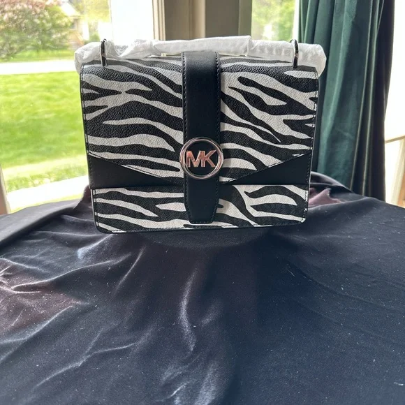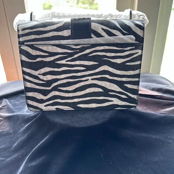 This Michael Kors crossbody bag showcases a bold black and white zebra print, complemented by sleek black leather accents. Its structured design and durable material make it a stylish and practical choice for any occasion.