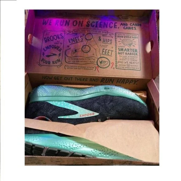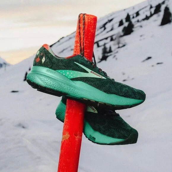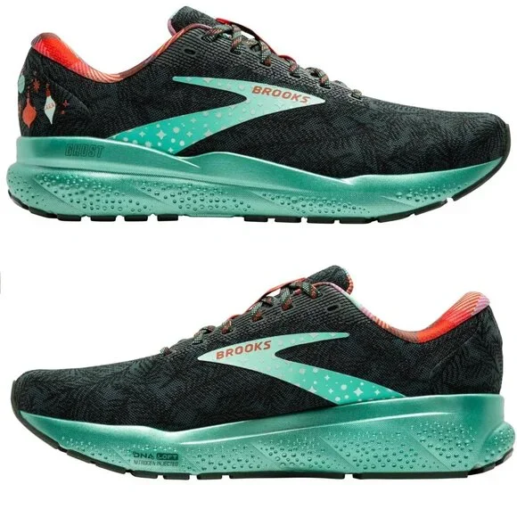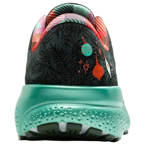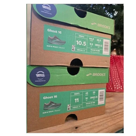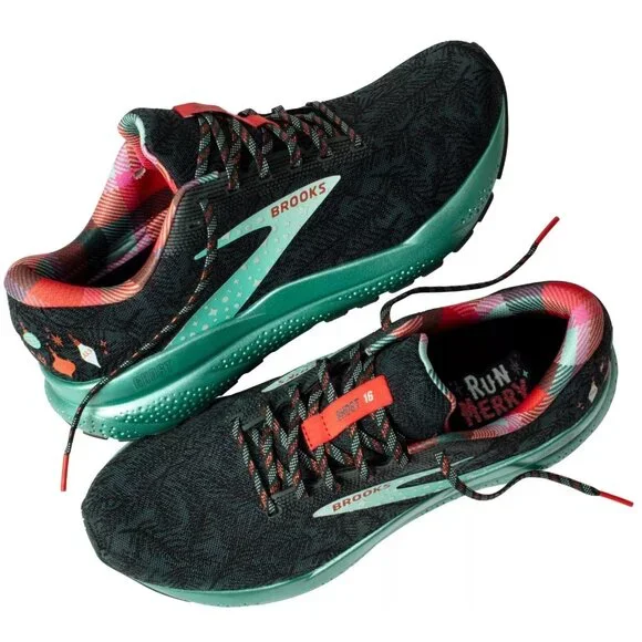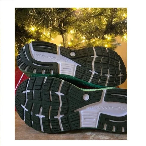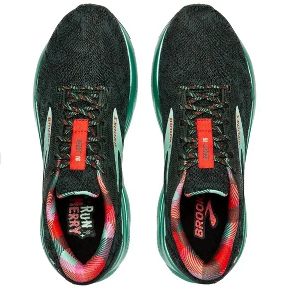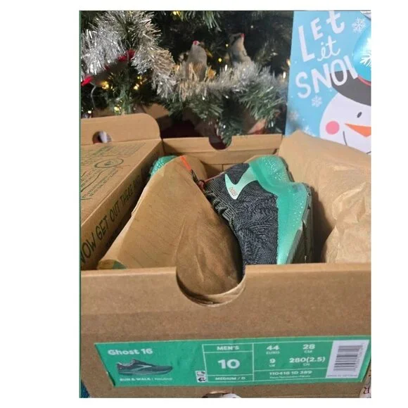Brooks Men´s Ghost 16 ´Run Merry´ Running ShoePosy/Sycamore/Fiesta1104181D 389Medium/Standard WidthNew IN SPECIAL HOLIDAY BOXThe Run Merry edition will have you ho-ho-hoing into the holiday season and it´s here to sleigh! Decked out with a plaid heel collar lining, vintage ornament heel details, and a pine tree pattern on the upper, this shoe is all heart, sole, and holiday spirit. Glide through your runs on the new nitrogen-infused DNA LOFT v3 midsole for cloud-like cushion without the weight. The green midsole with recycled silica RoadTack rubber provides a light yet durable grip. With materials equivalent to 4.3 plastic water bottles, it´s spooky just how smooth and reliable your Ghost 16 makes a jog feel!Built for neutral runners who don´t need a lot of extra support. These sneakers are a perfect choice for medium to high arches.Mid-Level Cushion ensures every step feels cushioned yet springy for tons of energy and comfort on runs of any length.Heel to toe drop of 12 mm for a balanced stride.Feather-light at just 9.8 ounces, making every run feel effortless.Engineered air mesh upper is lightweight and breathable for comfort in all temperatures.Nitrogen-infused DNA LOFT v3 midsole provides responsive and plush cushioning.Long-lasting RoadTack rubber outsole offers durable traction for reliable runs.Made with recycled materialsNote to My Holly-Jolly Buyers:All items are brand-new, unused and in their original packaging, unless otherwise stated.