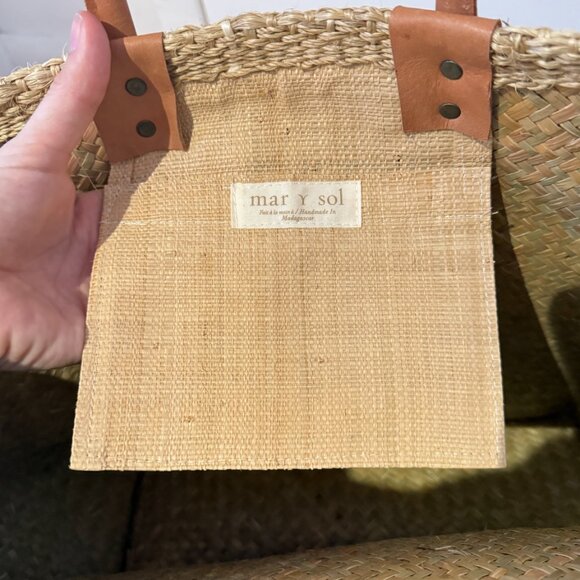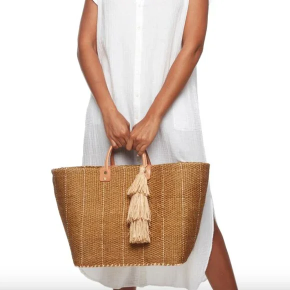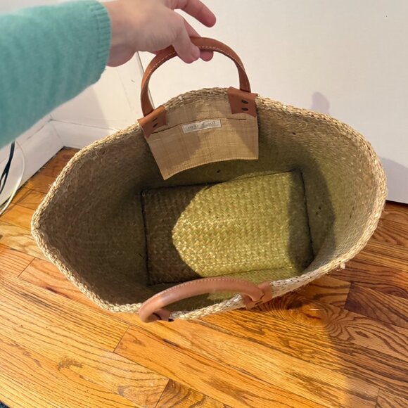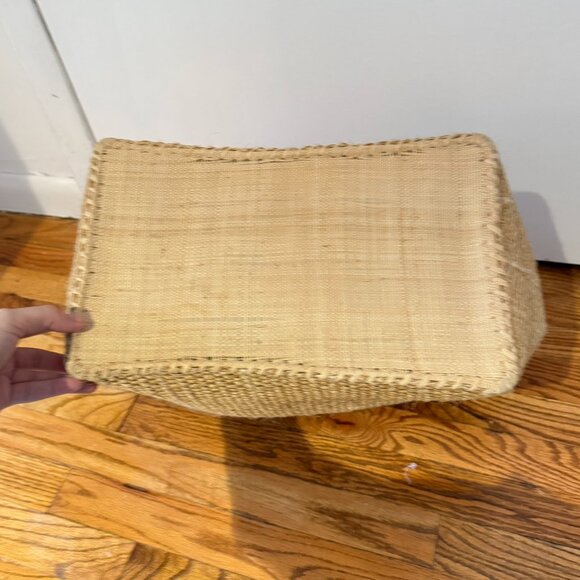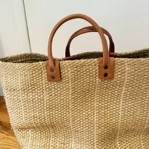 Woven sisal basket tote bag. Inside pocket. Leather handles.The actual bag is lighter in person than the ecom sand color. Gorgeous beach bag perfect for a weekend in Montauk, a holiday or a bachelorette weekend.
