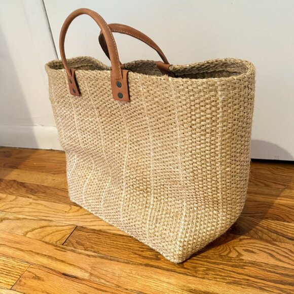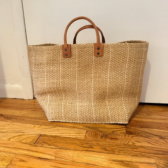 Woven sisal basket tote bag. Inside pocket. Leather handles.The actual bag is lighter in person than the ecom sand color. Gorgeous beach bag perfect for a weekend in Montauk, a...