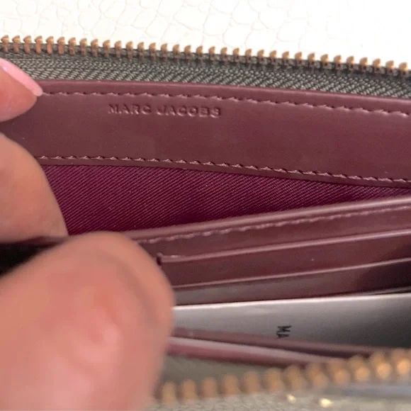 MARC JACOBS Khaki Green Leather Zip-Around Wristlet Wallet Material - LeatherColor - Khaki Green (see photos)Size - 7.5"w x 3.9"h x .9"d6.5" wristlet strap (all approx.) Style - Wistlet Wallet Exterior - golden tone hardware, Zip around top, MJ logo at front and slip pocket at back.Interior -Burgundy leather, 6 credit card pockets large center compartment and back & front slip pocket.New with TagsRetail - $185.00
