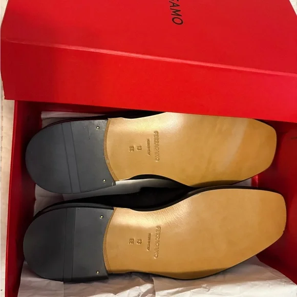 Experience timeless elegance with Salvatore Ferragamo´s black loafers, featuring a sleek leather finish and a sophisticated metallic accent. These slip-ons are perfect for formal occasions, offering both style and comfort.