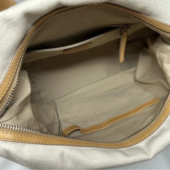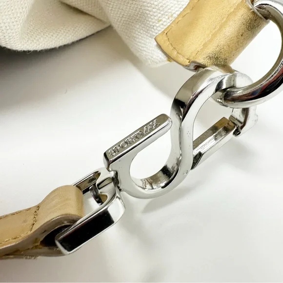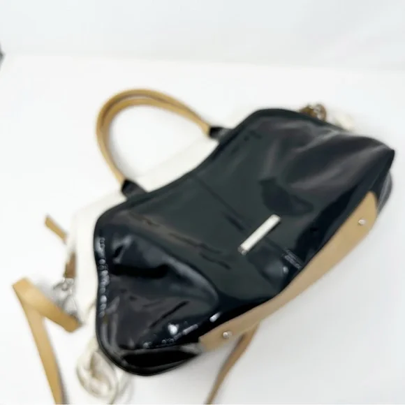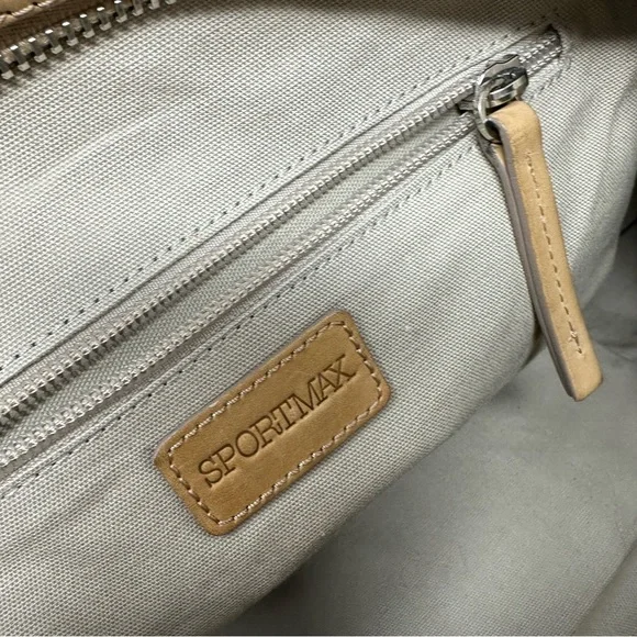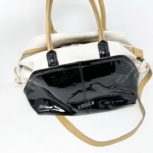 Gorgeous SportsMax bag in very good preloved condition, canvas & patent leather, with natural leather “Diego” detailing. H 12" W 18" D 6"Handle 6” dropCrossbody Strap 38”Awesome spring summer bag.