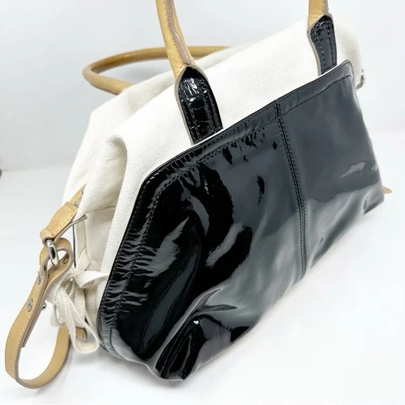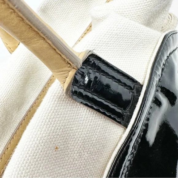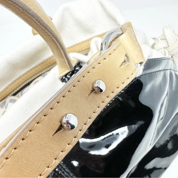 Gorgeous SportsMax bag in very good preloved condition, canvas & patent leather, with natural leather “Diego” detailing. H 12" W 18" D 6"Handle 6” dropCrossbody Strap...