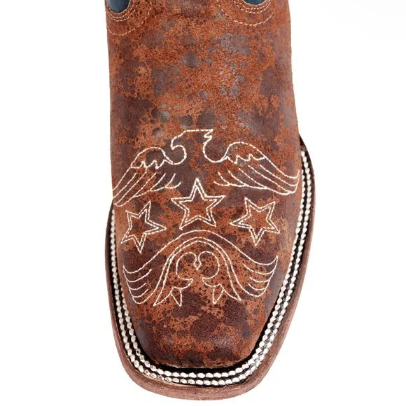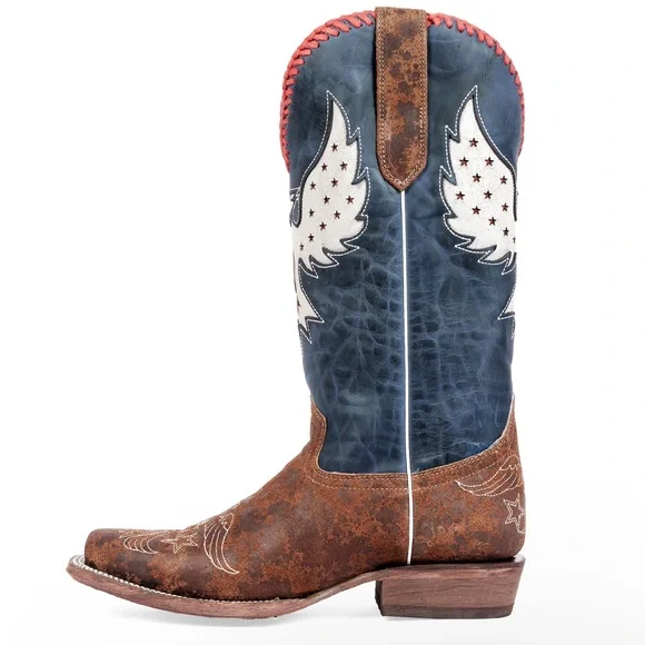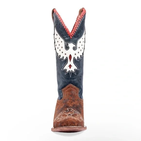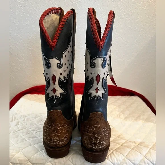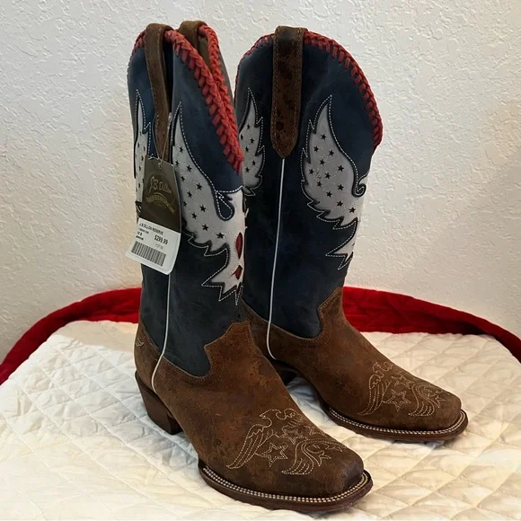 J.B. DILLON MORNING GLORY WOMANSWESTERN BOOTSNO BOXNEW WITH TAGS NEVER WORNRETAIL PAID 335.00SIZE 10BCOLOR BROWN/ RED/WHITE/BLUEWHITE EAGLE PATRIOTIC DESIGNSTURDY STRIKING &...