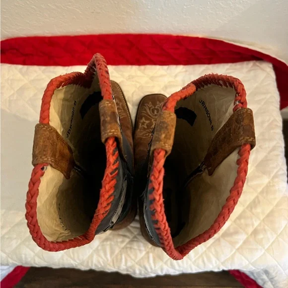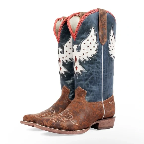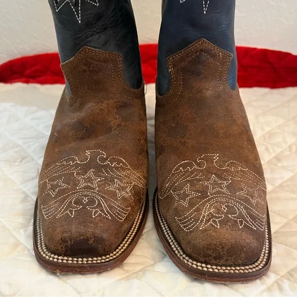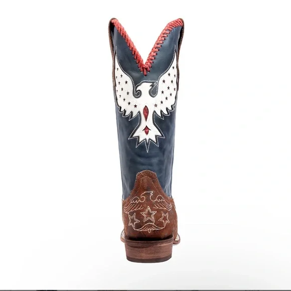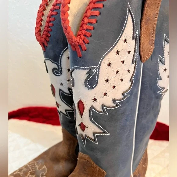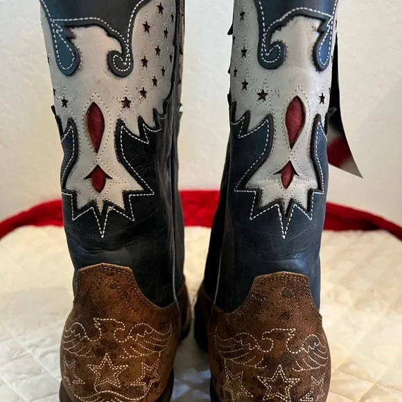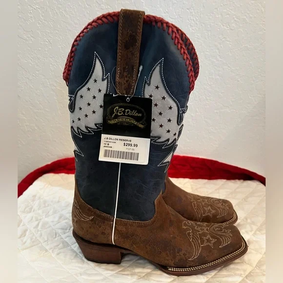 J.B. DILLON MORNING GLORY WOMANSWESTERN BOOTSNO BOXNEW WITH TAGS NEVER WORNRETAIL PAID 335.00SIZE 10BCOLOR BROWN/ RED/WHITE/BLUEWHITE EAGLE PATRIOTIC DESIGNSTURDY STRIKING & STYLISHLASTING IMPRESSION EVERYWHERE YOU GOSNIP TOE /STITCHED EAGLE ON TOESHAFT HEIGHT 13"HEEL 1 3/4"PULL ON TABSGENUINE LEATHER*PERFECT BOOTS FOR ANY WARDROBE**NO LOW BALL OFFERS ACCEPTED**NO TRADES NO RETURNS*