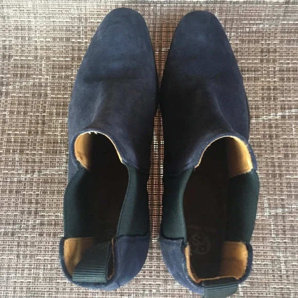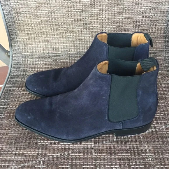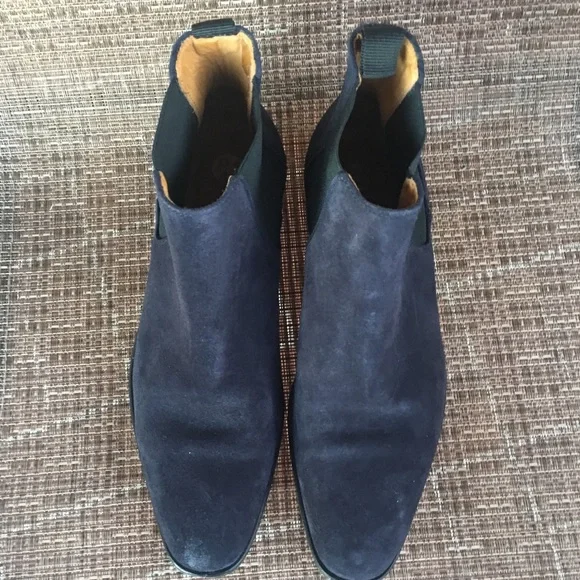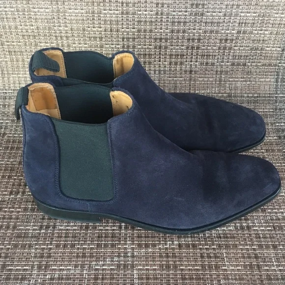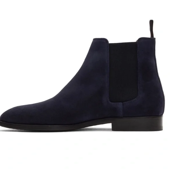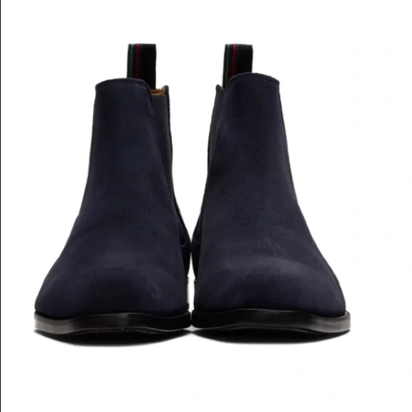 PS Paul Smith Boots.Ankle-high suede Chelsea boots in ´dark´ navy. Almond toe. Elasticized gusset in black at sides. Excellent condition. Grosgrain pull-tab in black at heel collar. Leather sole in black. Tonal stitching.Leather. Made in Portugal.Currently regular price and this size is sold out.Size UK 6 which is a US 7