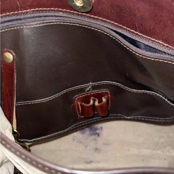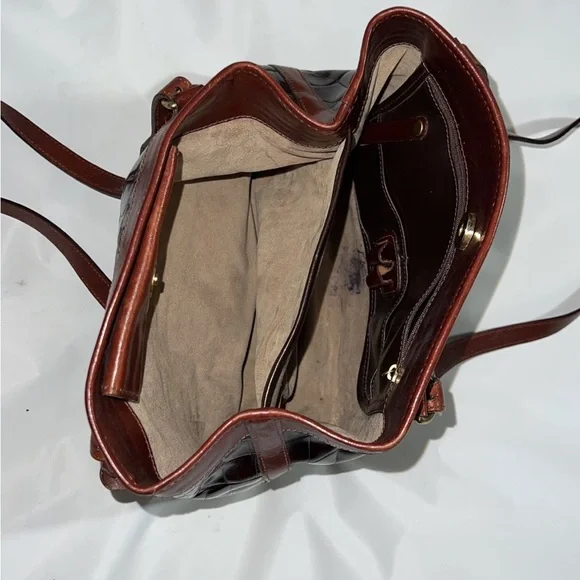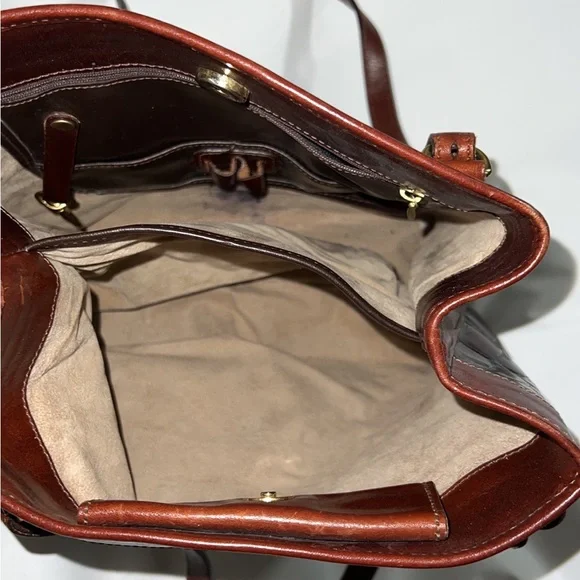 Brahmin Pecan & Black Crocodile embossed Leather Purse gently pre-owned authentic designer vintage Brahmin brand Purse/Handbag Genuine Leather Shoulder Bag Tote Style A classic smooth black leather with ox blood redish-brown croc embossed & Beige velour-like fabric lining Brass hardware accents & Name brand brass hang tag attached/included Top magnetic snap closure & Top double straps with adjustable settings 2 main interior compartments with center divider 1 interior zippered pocket, 2 open card pockets, 2 pen/pencil holders and key fob clip 10´´H x 10.5´´L x 4´´W Current 16" strap drop with 2 additional strap settings Rare and hard to find style Top quality Gently pre-owned condition (pen mark inside see picture some scuffs/nicks on exterior sides/corners- see photos)