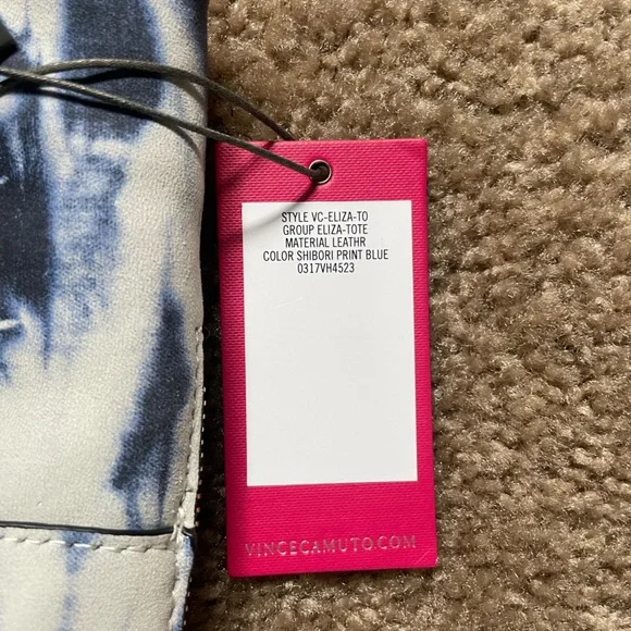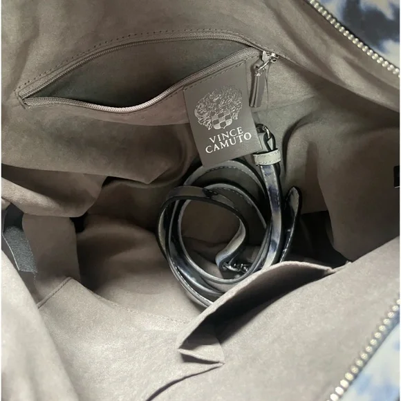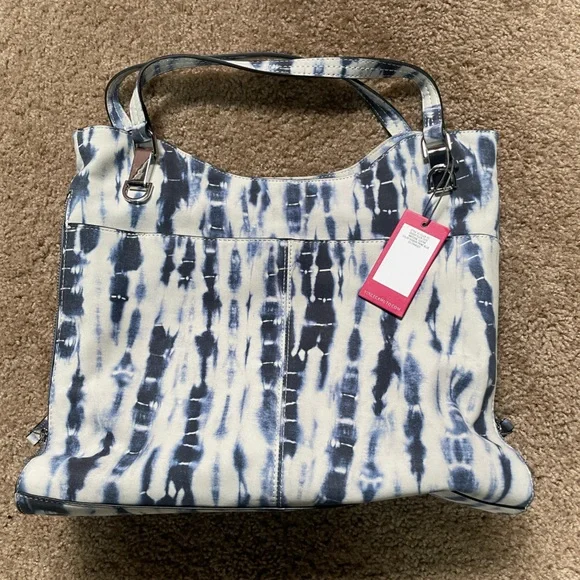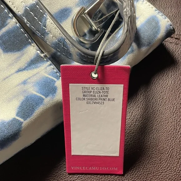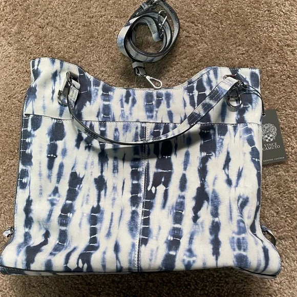 VINCE CAMUTO LAMB LEATHER ELIZA TOTE BAG. SHIBORI PRINT BLUE.