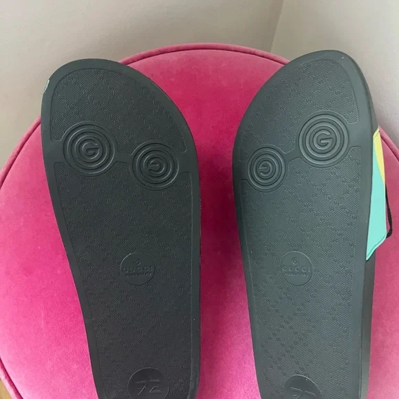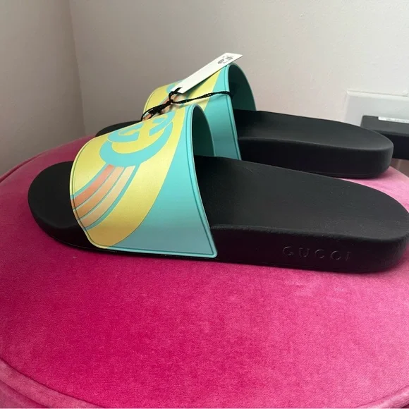 NWT Rubber GG Rainbow Mens Pursuit Pool Slide Sandals Aquamarine. Comes with 2 dust bags and the shoe box! Is in size 11, which translates to US size 11.5Step out in style with these slide sandals for men, which offer both comfort and fashion. Perfect for casual outings.
