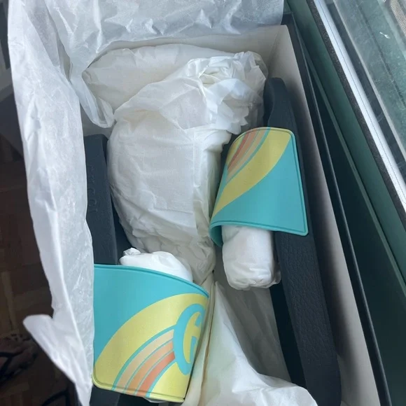 NWT Rubber GG Rainbow Mens Pursuit Pool Slide Sandals Aquamarine. Comes with 2 dust bags and the shoe box! Is in size 11, which translates to US size 11.5Step out in style with...