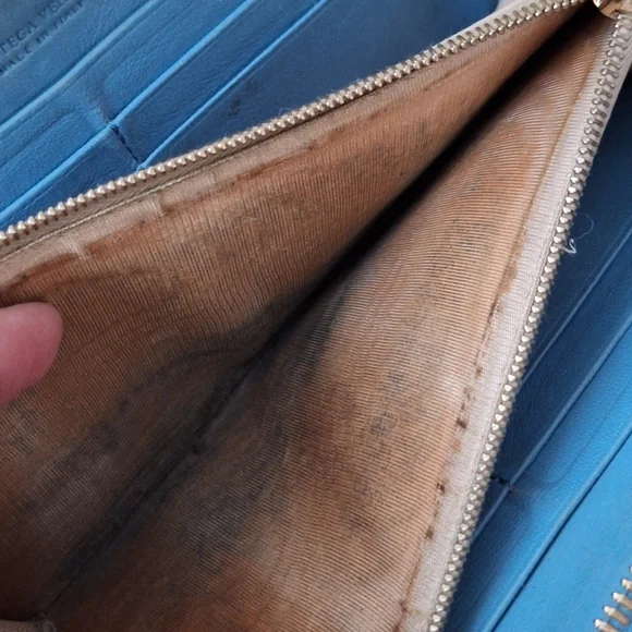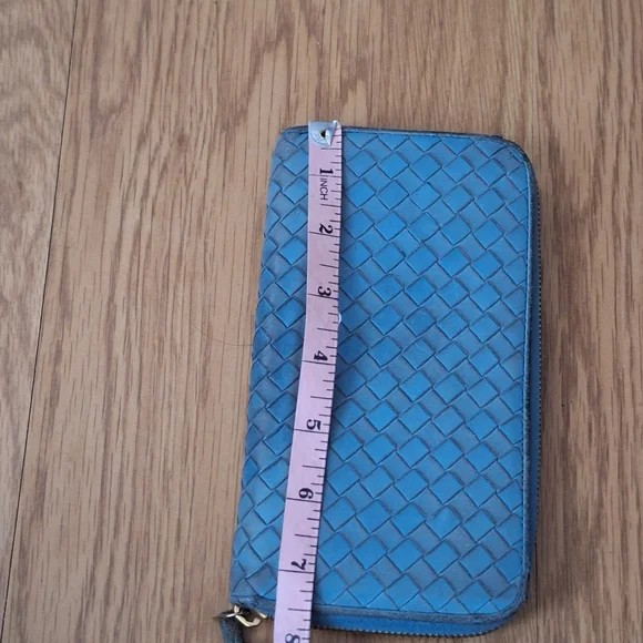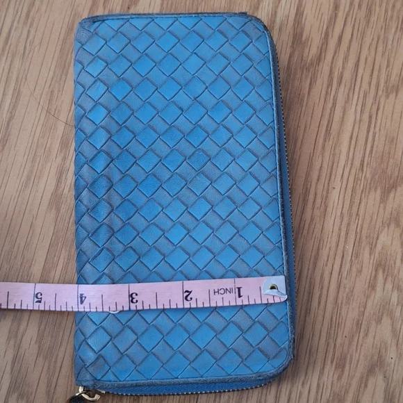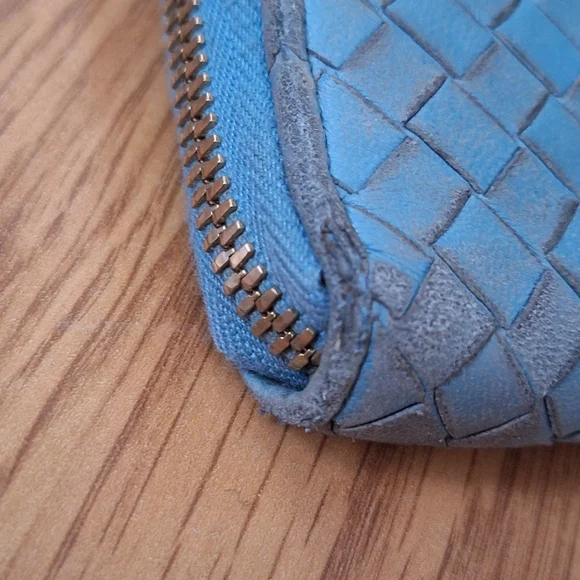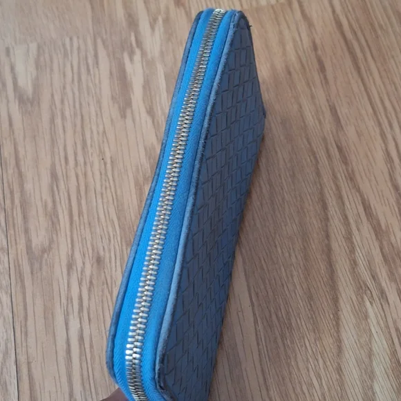 Light blue leather walletzip strobe closure with many compartments and coin compartment. Some fading to leather and wear to corners. Please see all picsSold as is Questions? Leave a comment below!