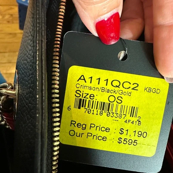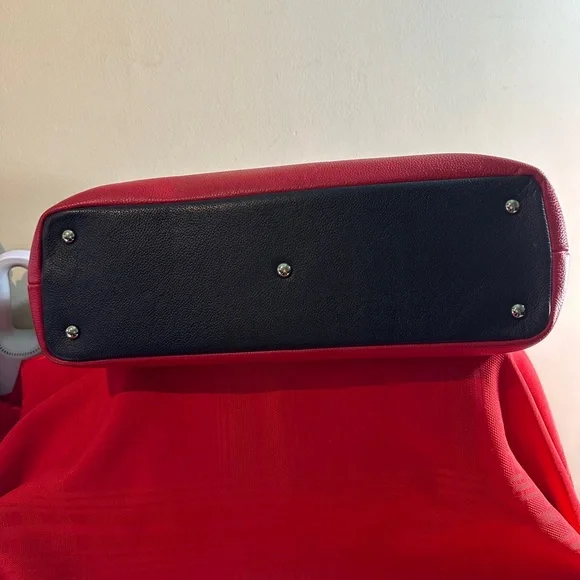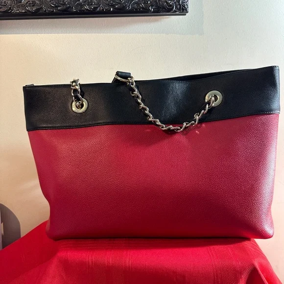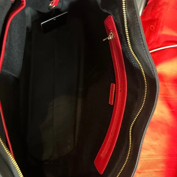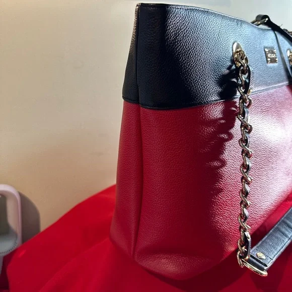 St. John NWT Red/Black Tote. Top zipper, interior zip pocket and two open pockets. Gold tone hardware. Dimensions 18 x 5 x 11 inches