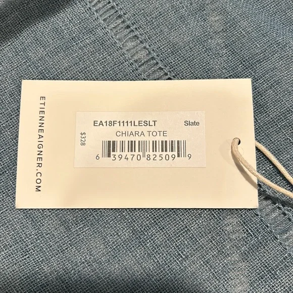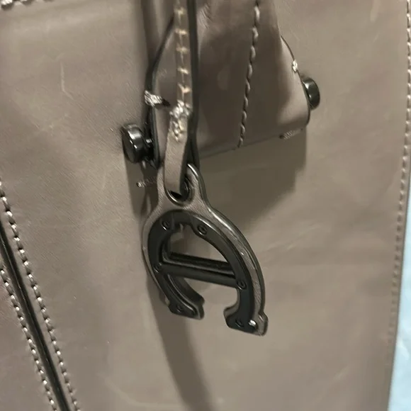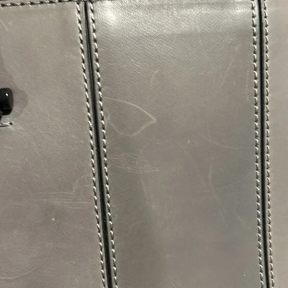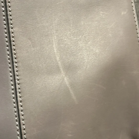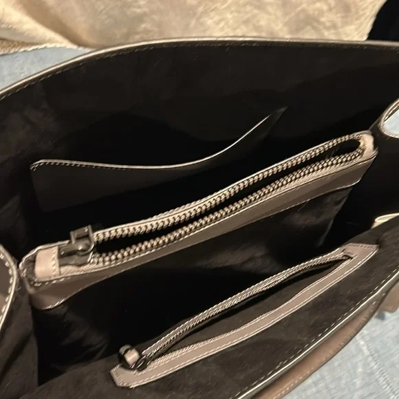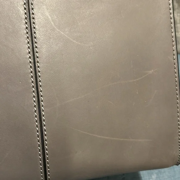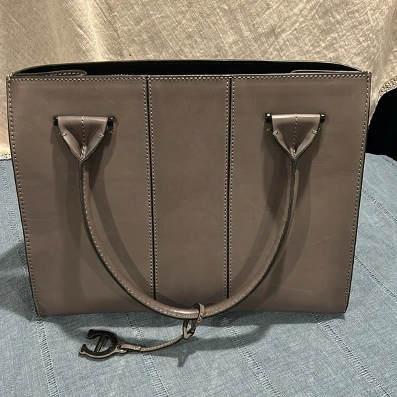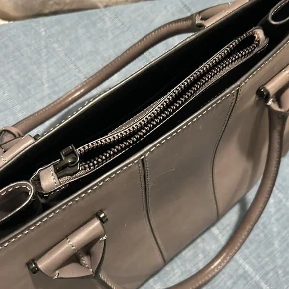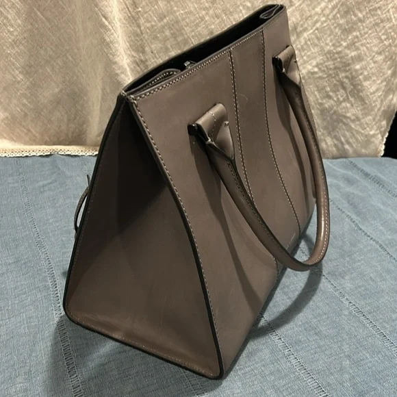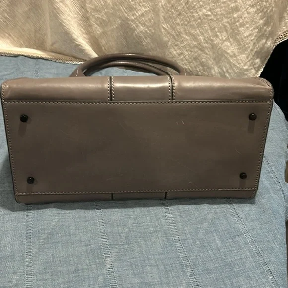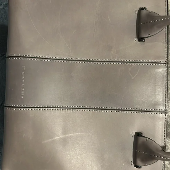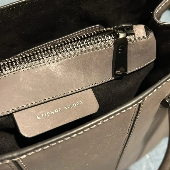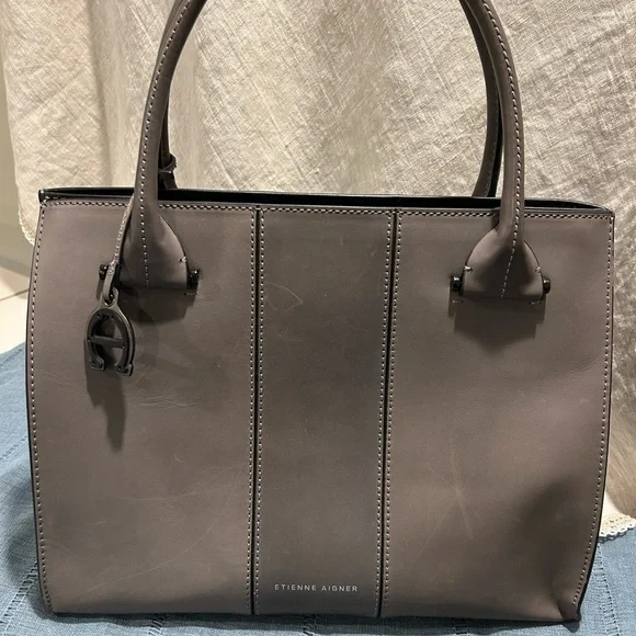 Etienne Aigner handbag. Smooth, Gray leather. Base with metal feet. Bag stands on own. Soft black fabric interior. Open top with side slide pocket and side zip pocket. Center divider zip pocket that is suspended so main compartment is open at bottom. See photos for scratches on leather. Comes with original tags and dust bag. Hanger tag. No wear on handles or corners. Handle drop 7”. Width-7.25”, length- 14.25”, height- 11.5”.
