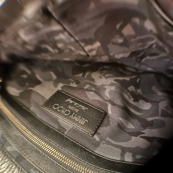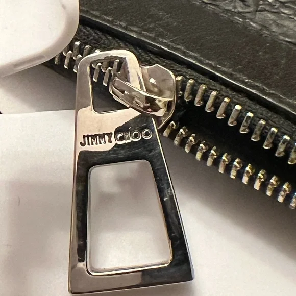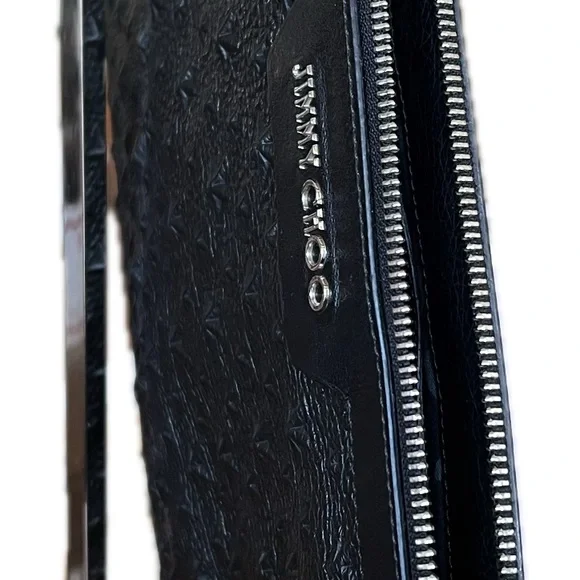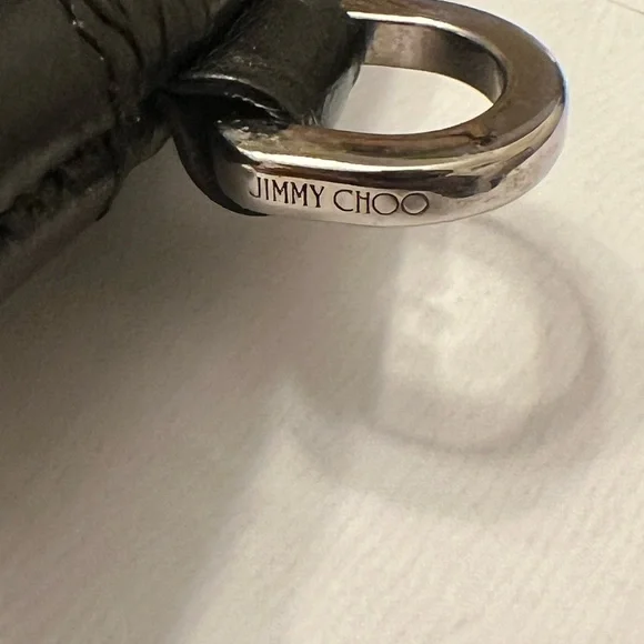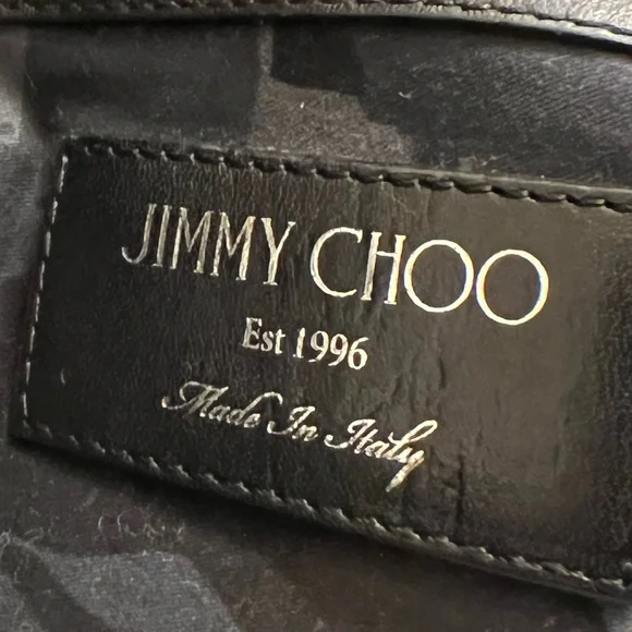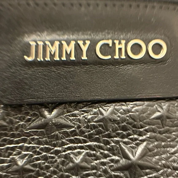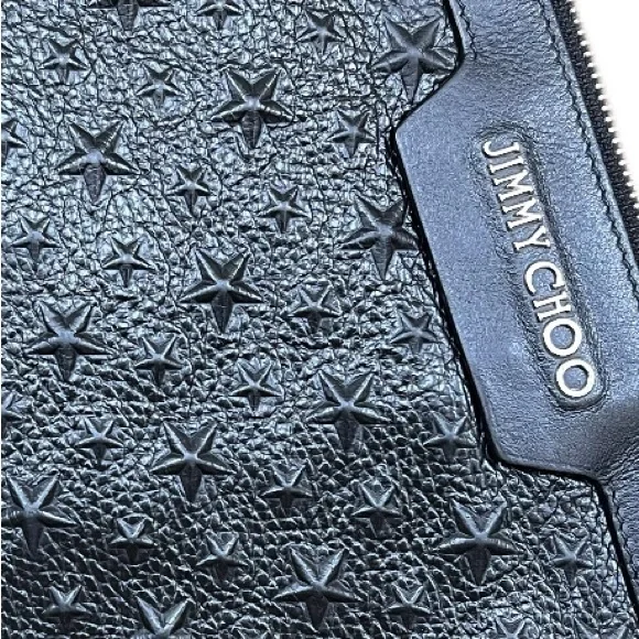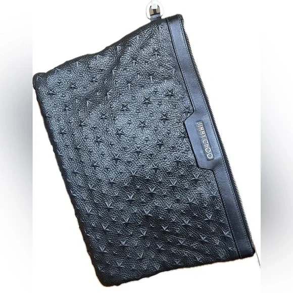 Jimmie Choo Derek Black Leather Star Embossed Envelope Bag/Clutch. Silver tone hardware. Excellent pre-loved condition. One “D” ring, that can be used to convert to wristlet. Wristlet Strap is not included. Room for small tablet, any size cellphone, wallet… Interior and exterior are clean. No callouts. NOW SELLING ON OTHER PLATFORMS FOR $260. and ABOVE!Please feel free to ask any questions. All reasonable offers will be considered. ALL LOWBALL OFFERS WILL NOT BE ACKNOWLEDGED.All Sales are Final, No returns.If you like it, make an offer and let’s make a deal. Thank you for viewing!