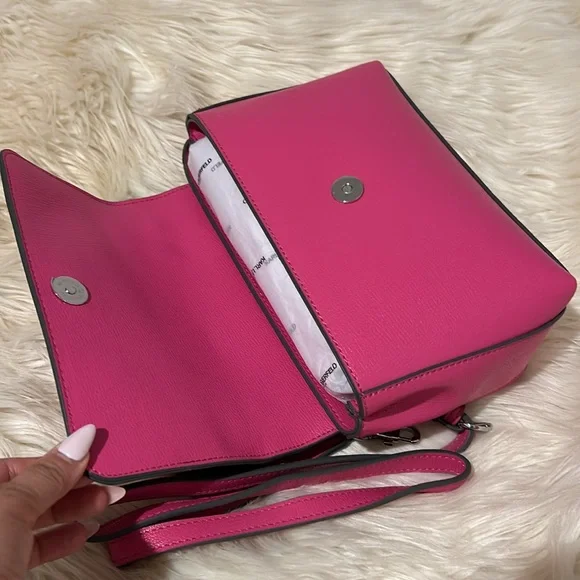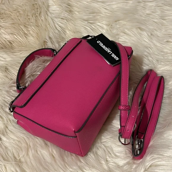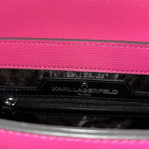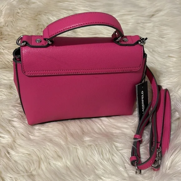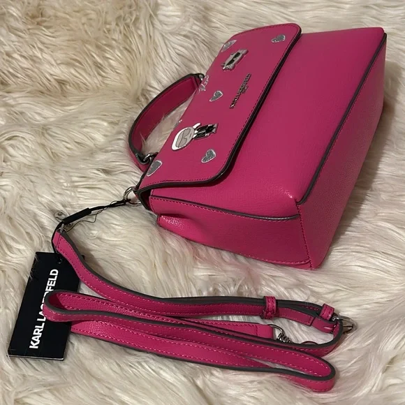 Karl Lagerfeld Vibrant Pink handbag with signature charms & silver hearts NEW! Removable strapMSRP $198Questions? Leave a comment below!