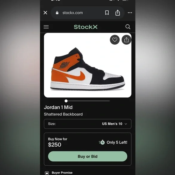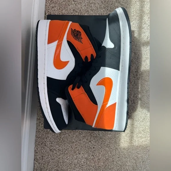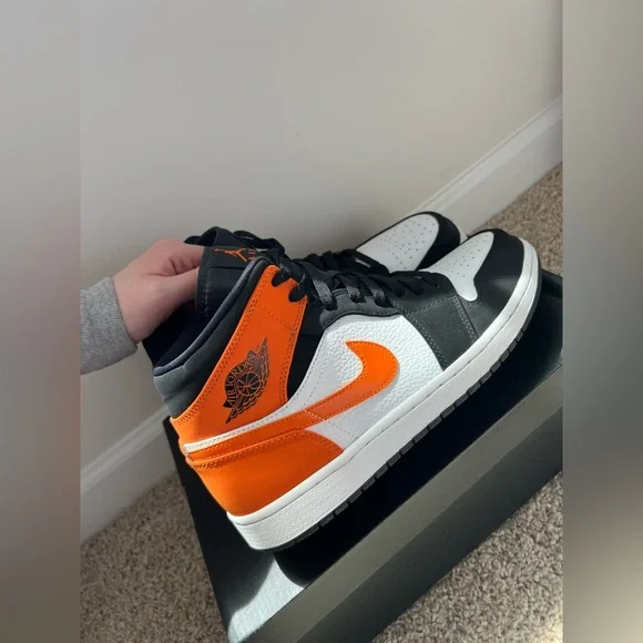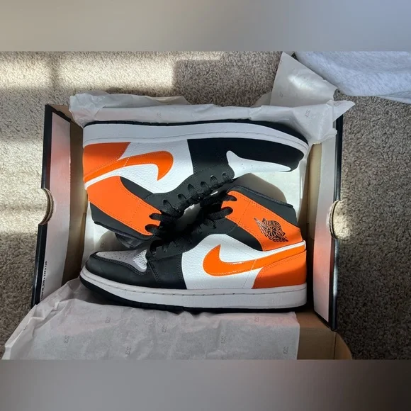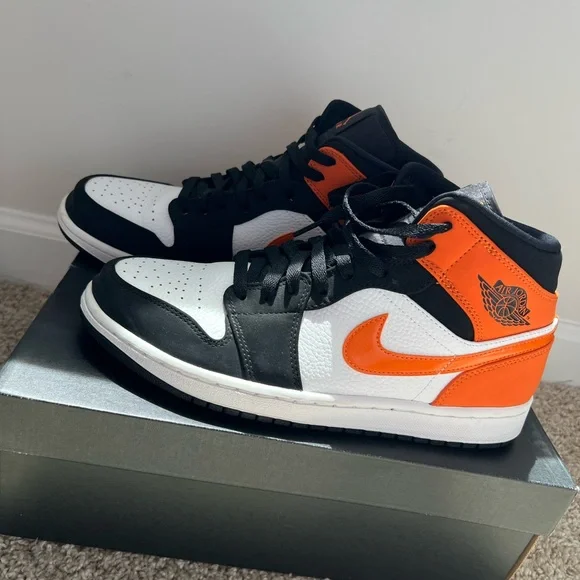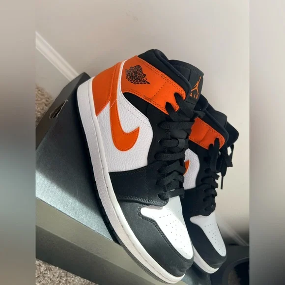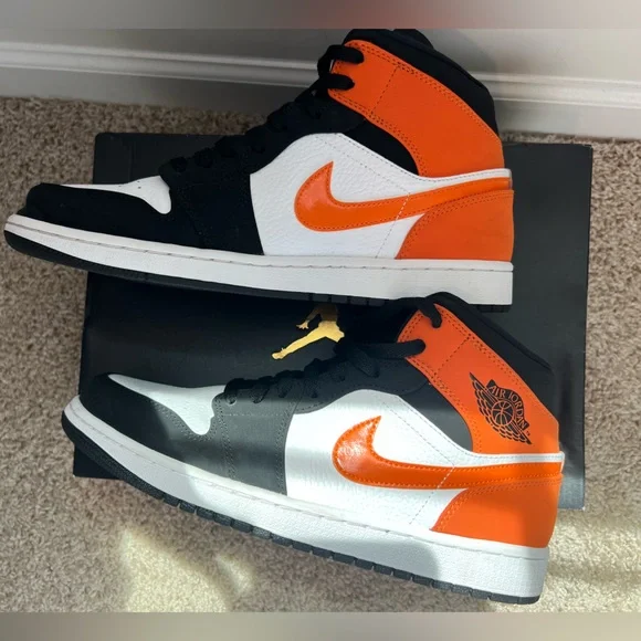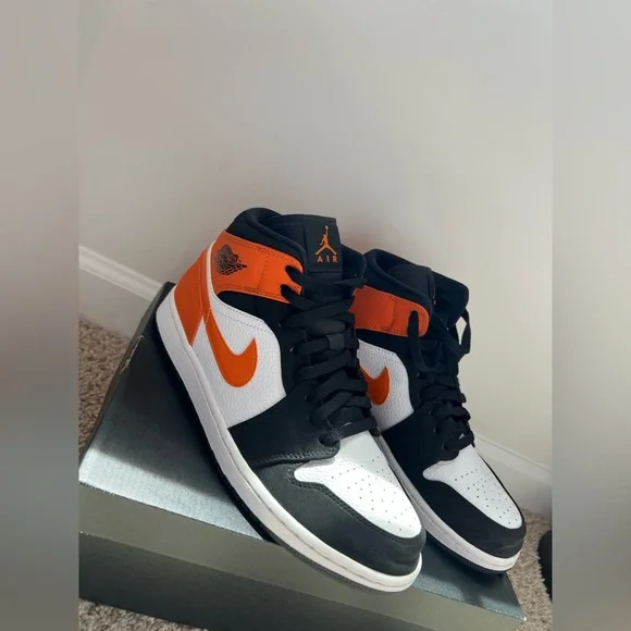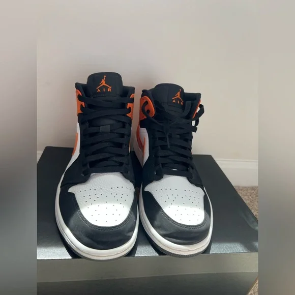 ✨ Jordan 1 Mid Shattered Backboard✨ Color: Black/White-Starfish✨ Size: Mens 10, Women’s 11.5✨ Condition: Excellent, worn once, nothing wrong with them just too big, no stains, no rips, smoke free home Ask me any questions or offers ☺️