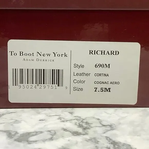 Brand: To Boot New York Size: 7.5MStyle: Chukka BootsColor: Cognac AeroMSRP: $450Condition: NewThe Richard chukka boot is a comfortable classic that you can wear casually, or dress up.Made from handsome top grain Italian calf leather which is subtly burnished to a lustre. You’ll find the Richard is supportive, comfortable and protective from the elements. Features:Round toe shapeLace closureBock heelLeather midsoleRubber or leather outsole. -HL