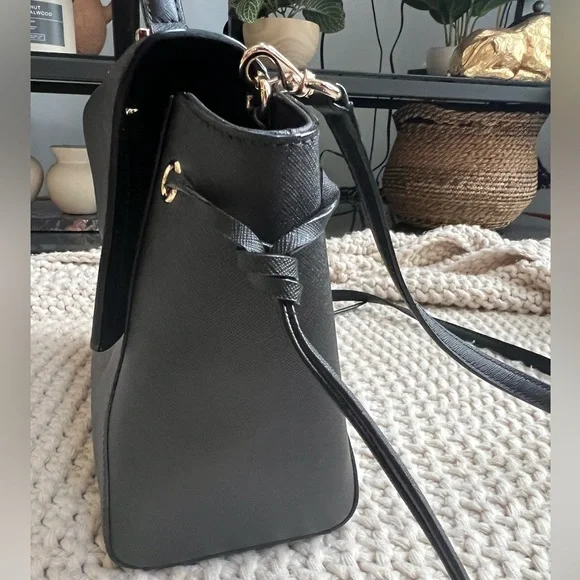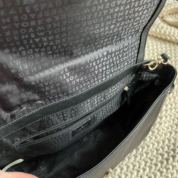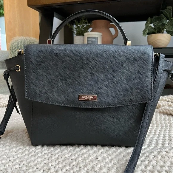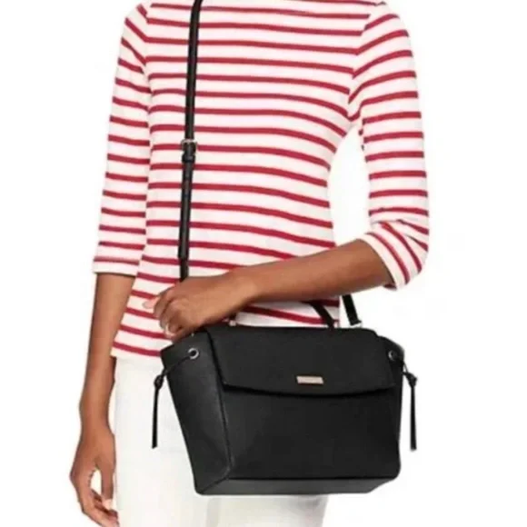 NWT Kate Spade Laurel Way Lilah top handle satchel with detachable, adjustable crossbody strap. Black saffiano leather with gold hardware. One interior zip pocket and two interior slip pockets. Snap closure.