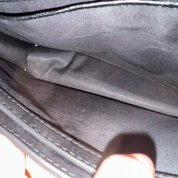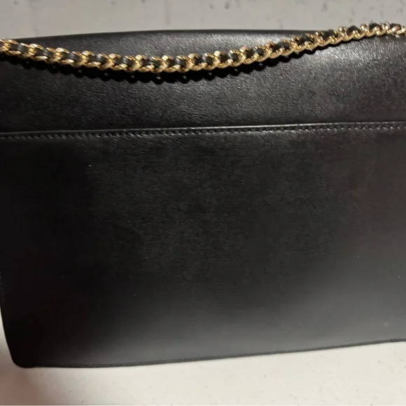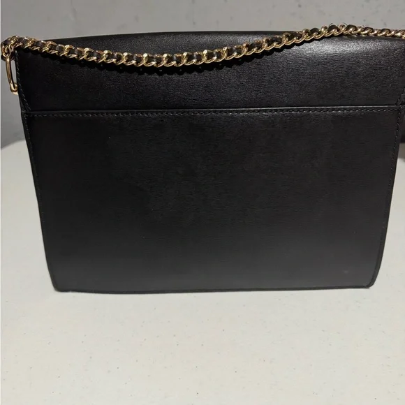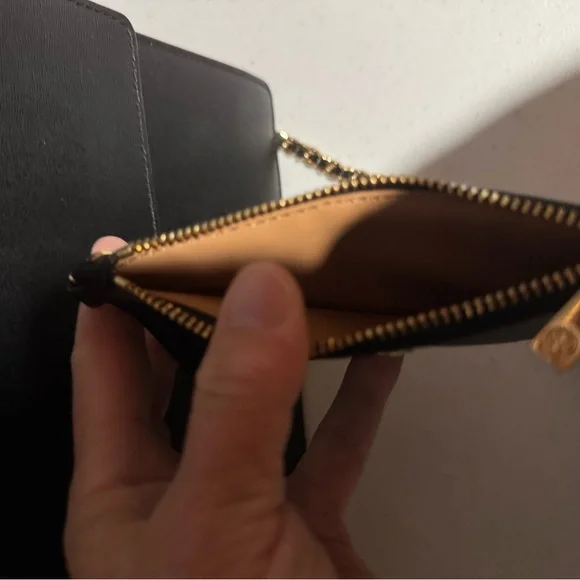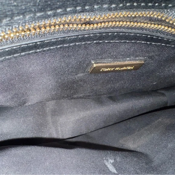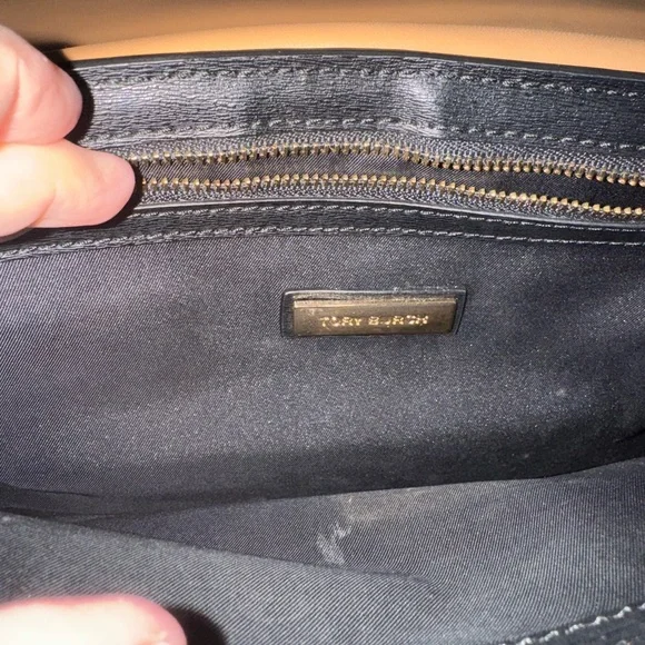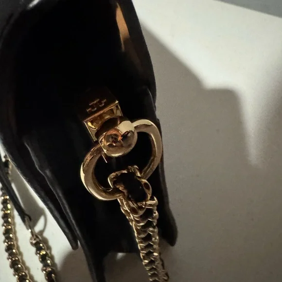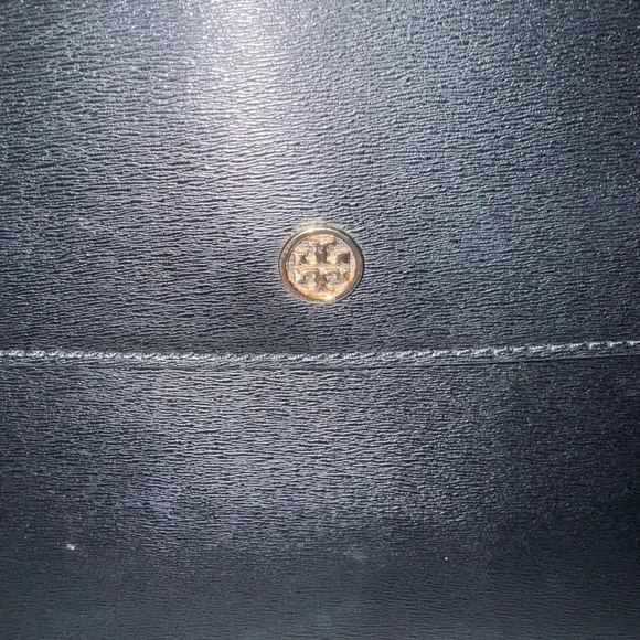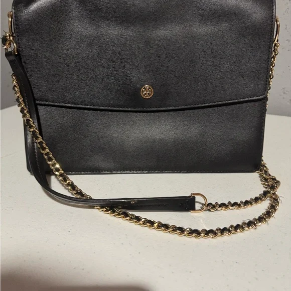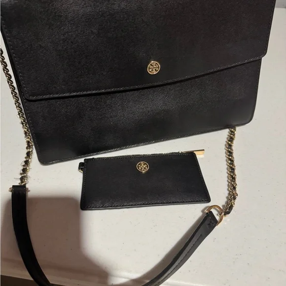 Tori Burch black leather crossbody bag and small change purse with gold accents. Perfect for any occasion. Measures approximately 11.5” x 9”Gently used preowned condition.