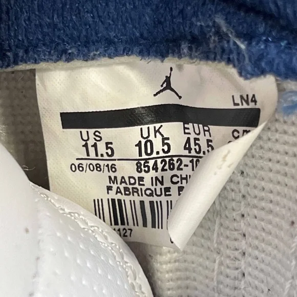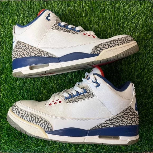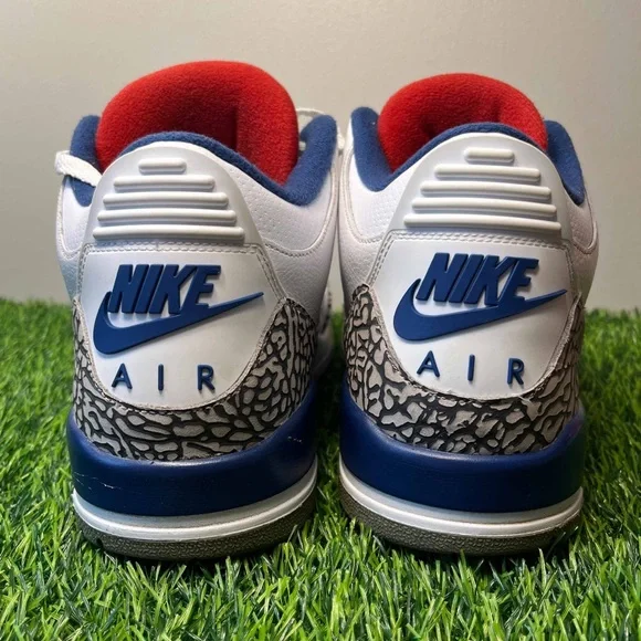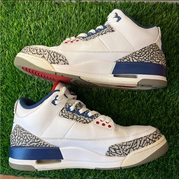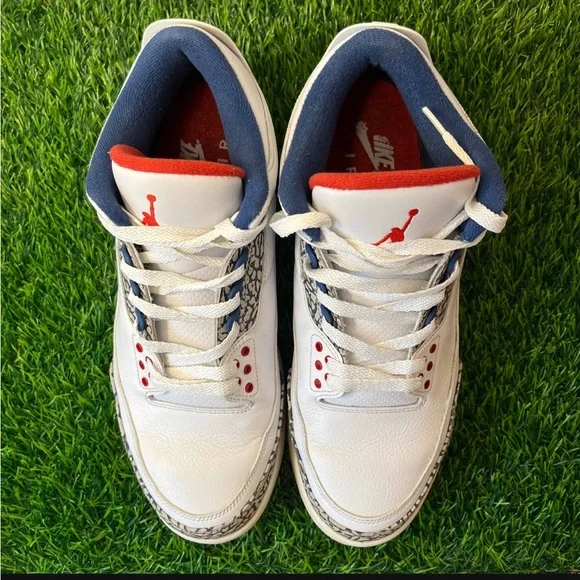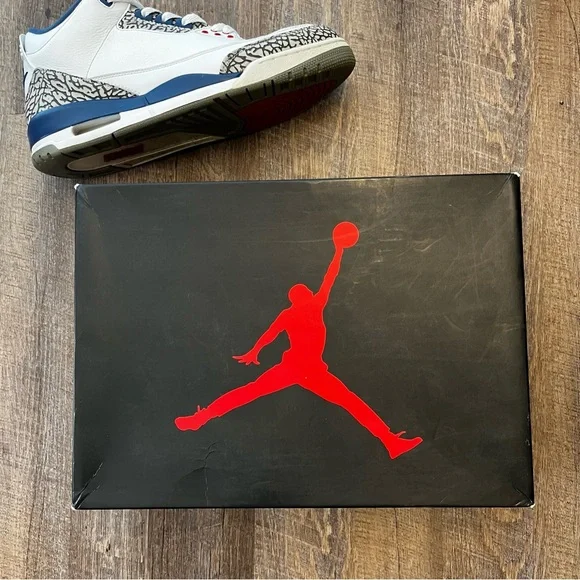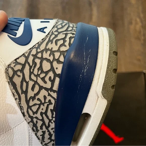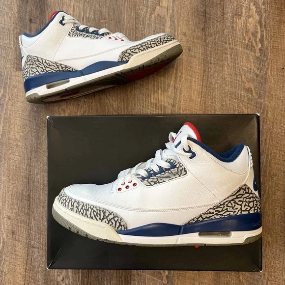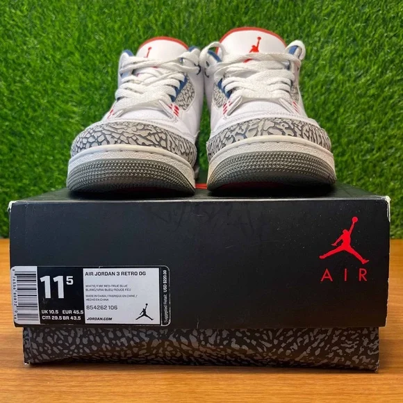 Air Jordan 3 III Retro True Blue 2016 White Size 11.5 Sneakers Shoes w/ Box 854262-106. Some light signs of wear but still look great. Come with the original (slightly flawed) box. Replacement laces. Slight wear in midsole paint which is an easy fix. Sick pair of kicks!