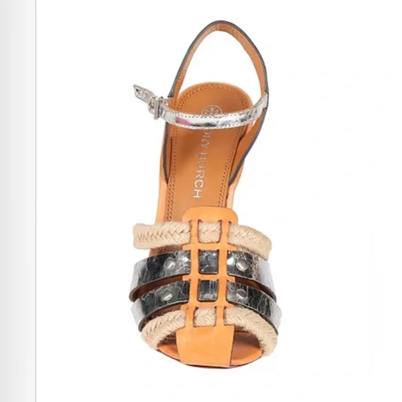 Tory Burch Fisherman Heel Sandal. Size 10.5, Brandy/Silver. NWT