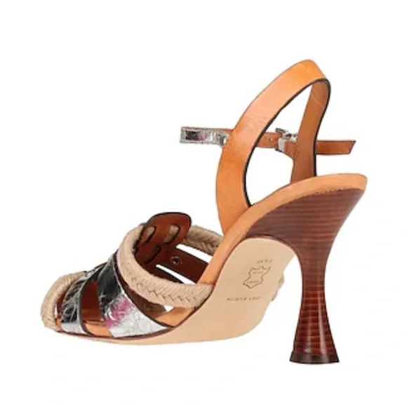 A new take on the fisherman sandal. The closed-toe design is crafted with an artful mix of materials - braided jute contrasts smooth and crackled metallic leather, and detailed with subtle brass hardware. The narrow ankle strap and curved heel highlight the feminine silhouette.COMPOSITIONVachetta leather/ Metallic leatherCowhide, Textile fibersMEASUREMENTSHeel height 3.71 inches