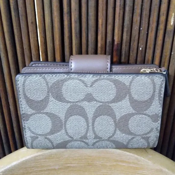 Coach Signature Medium Corner Zip. Khaki saddle 2. NWT. Care card.Signature coated canvas and smooth leatherSeven credit card slotsBill compartmentID windowSnap closureZip coin...