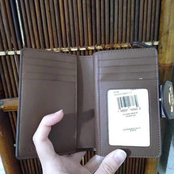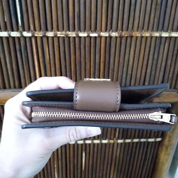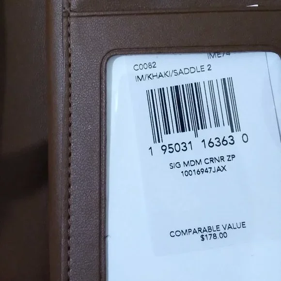 Coach Signature Medium Corner Zip. Khaki saddle 2. NWT. Care card.Signature coated canvas and smooth leatherSeven credit card slotsBill compartmentID windowSnap closureZip coin pocket5" (L) x 3 1/2" (H) x 1/2" (W)