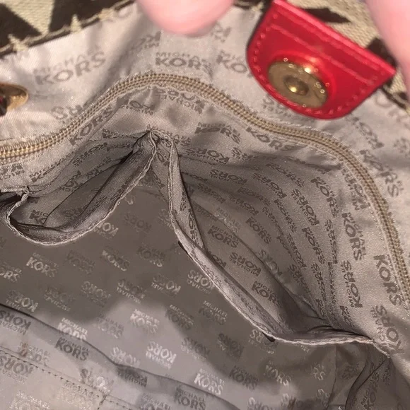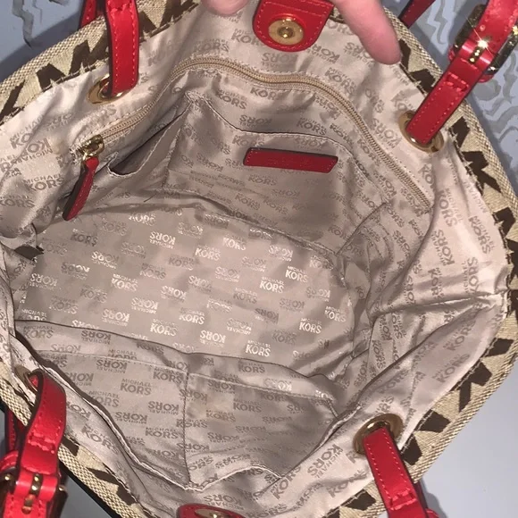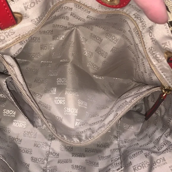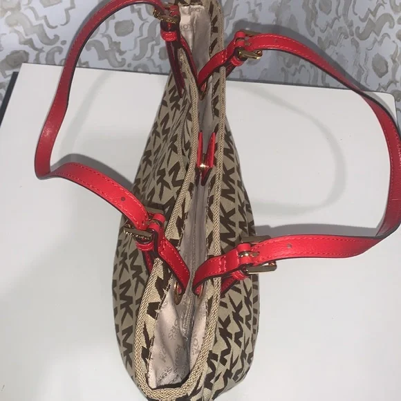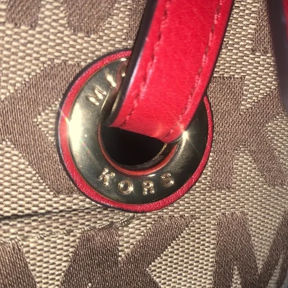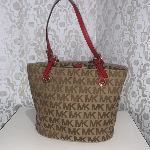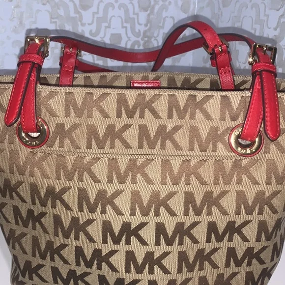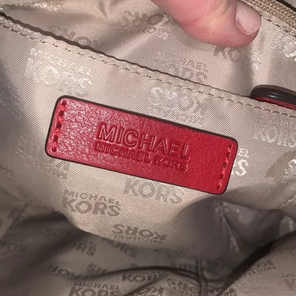 Pretty Red on signature MK Bag mid size is perfect, flawless no issues excellent condition, Measurements Height 10”Width 12”Depth 6.5”Straps off bag 9”Simple but elegant